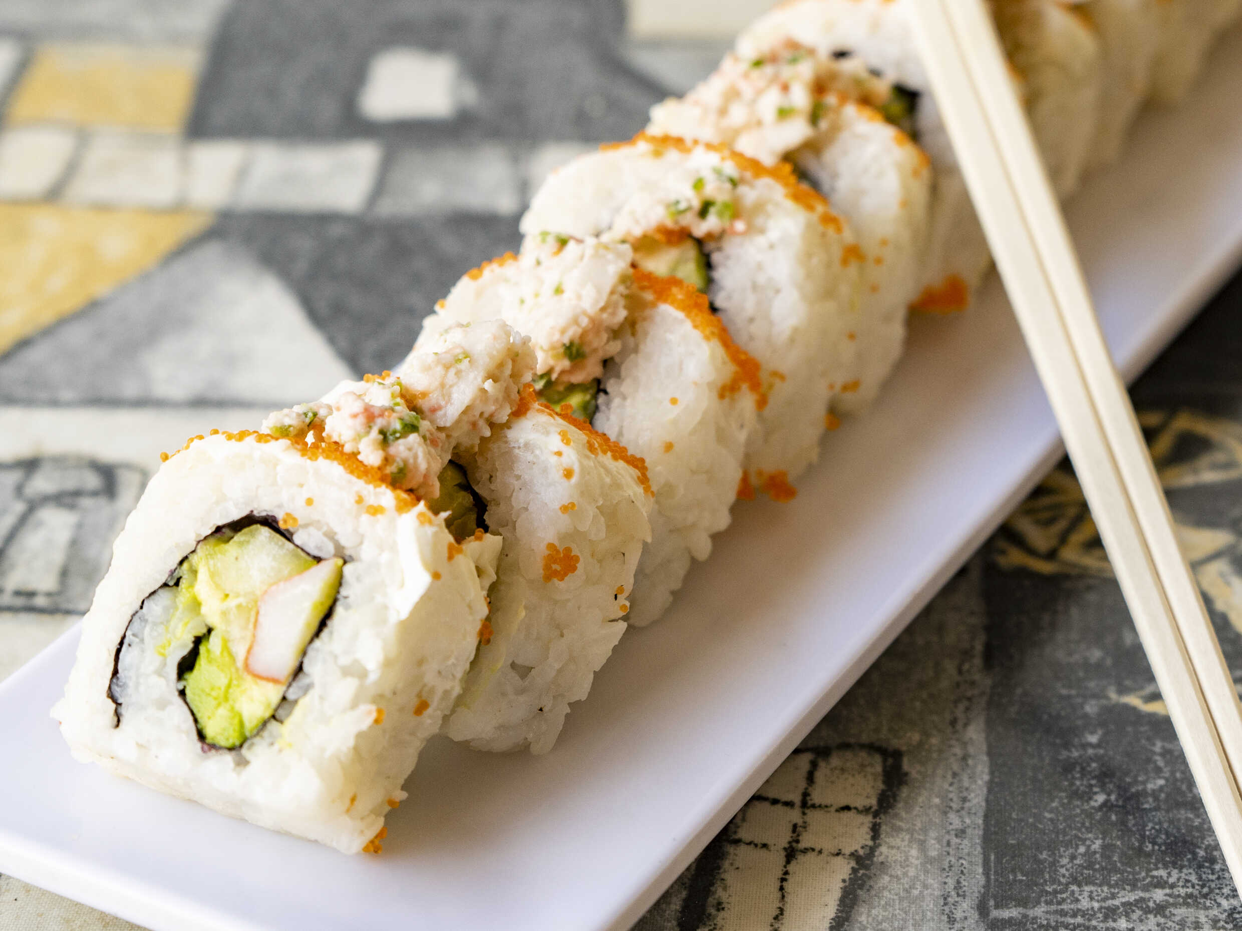 Cangrejo, pepino, queso, aguacate y camarón por fuera.