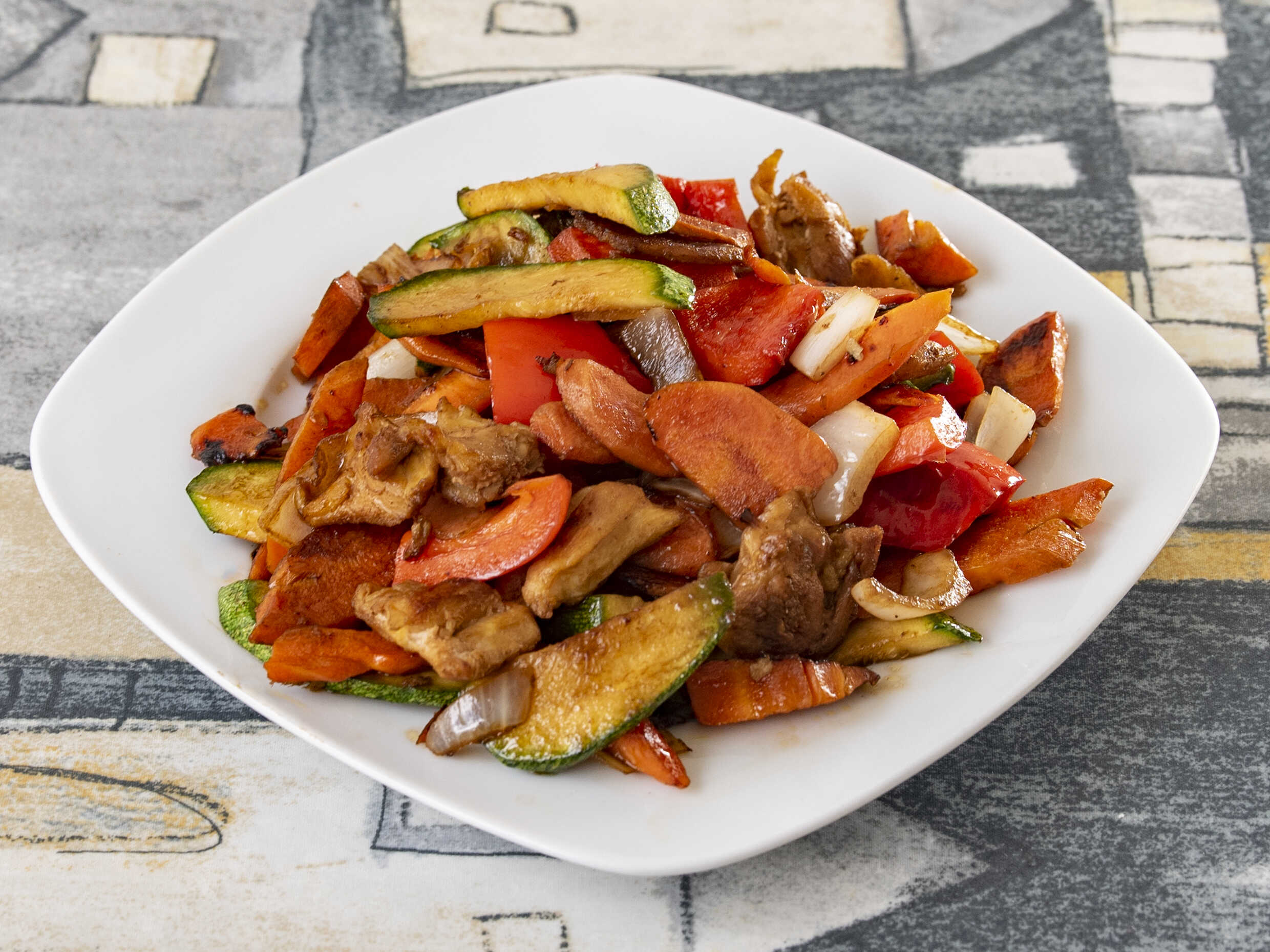 Arroz frito, zanahoria, calabaza, cebolla, pollo y arrachera.