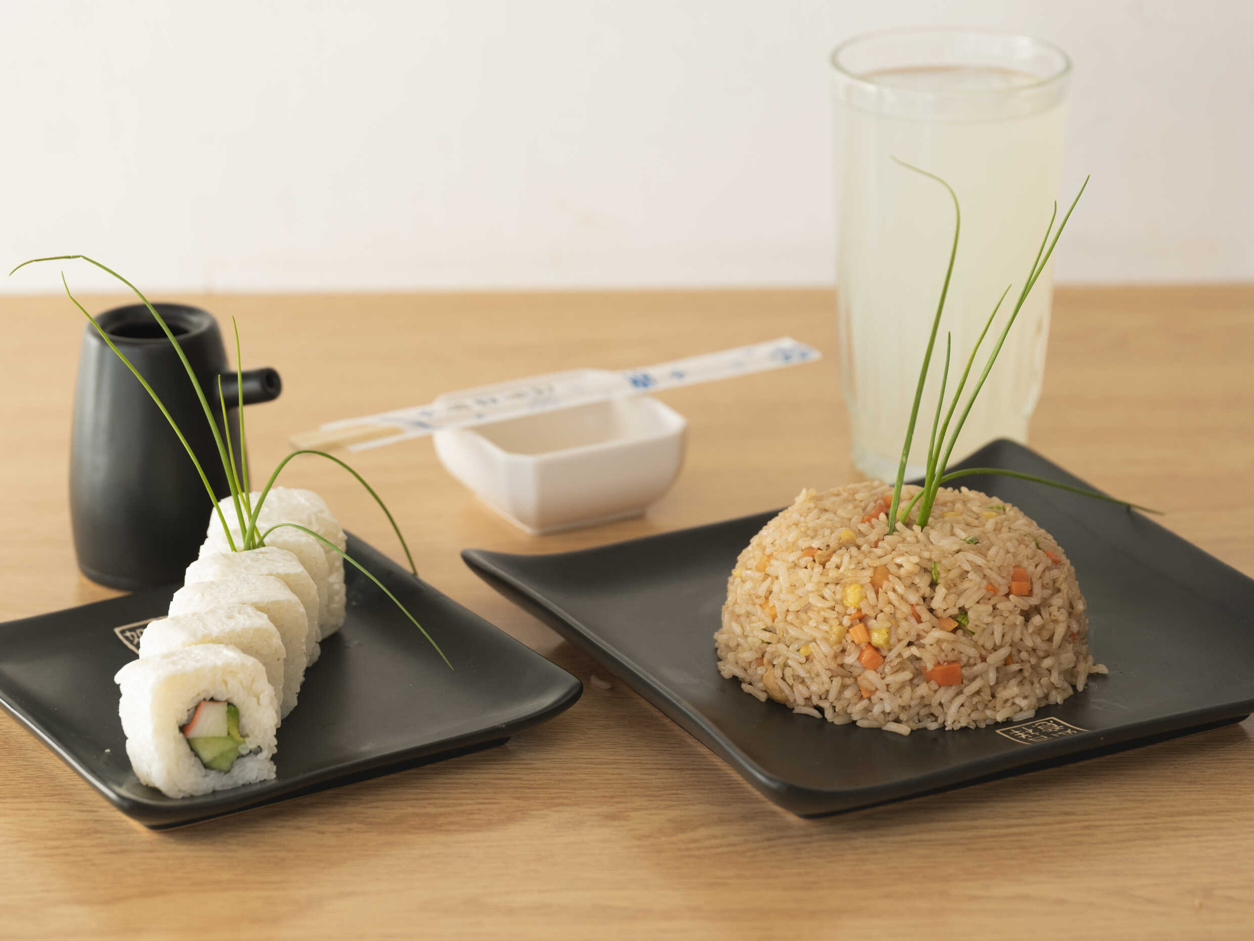1/2 rollo a elección, 1/2 yakimeshi y una bebida.