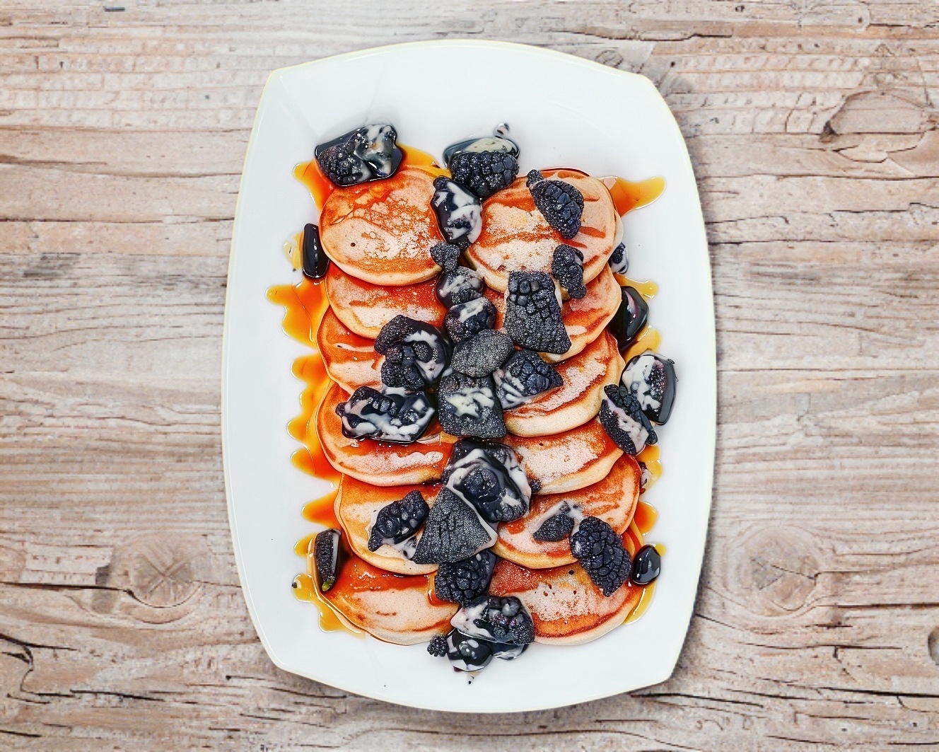 36 Mini pancakes, 3 untables, 3 topping y 3 frutas.