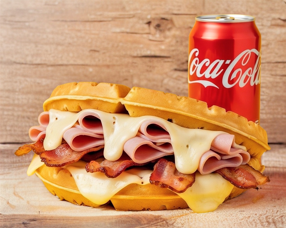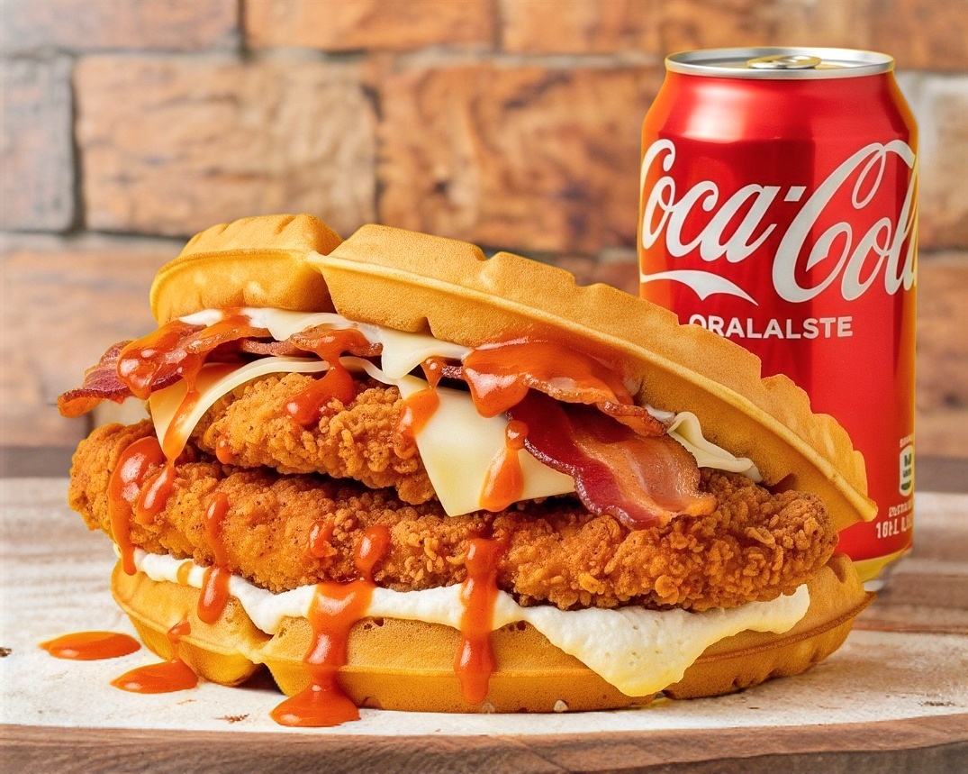 Waffle sándwich con tocino, pollo frito, queso monterrey Jack, aderezo de tu preferencia.