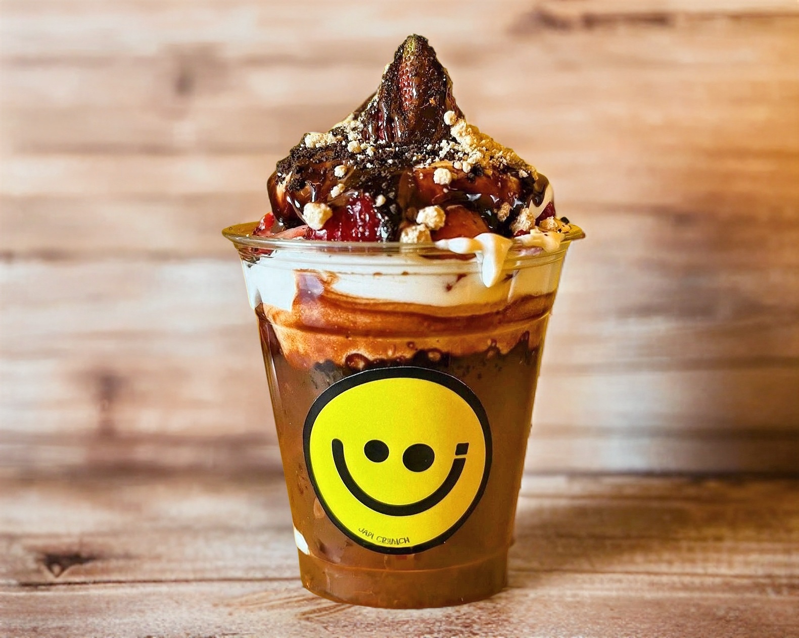 Helado de vainilla, jarabe de caramelo, chispas de chocolate y azúcar glass.