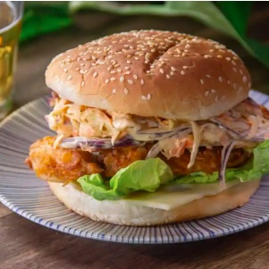 Medallones de pollo, lechuga, jitomate, cebolla y queso amarillo.