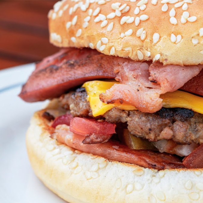 Carne, lechuga, jitomate, cebolla caramelizada, queso manchego, champiñones y tocino.