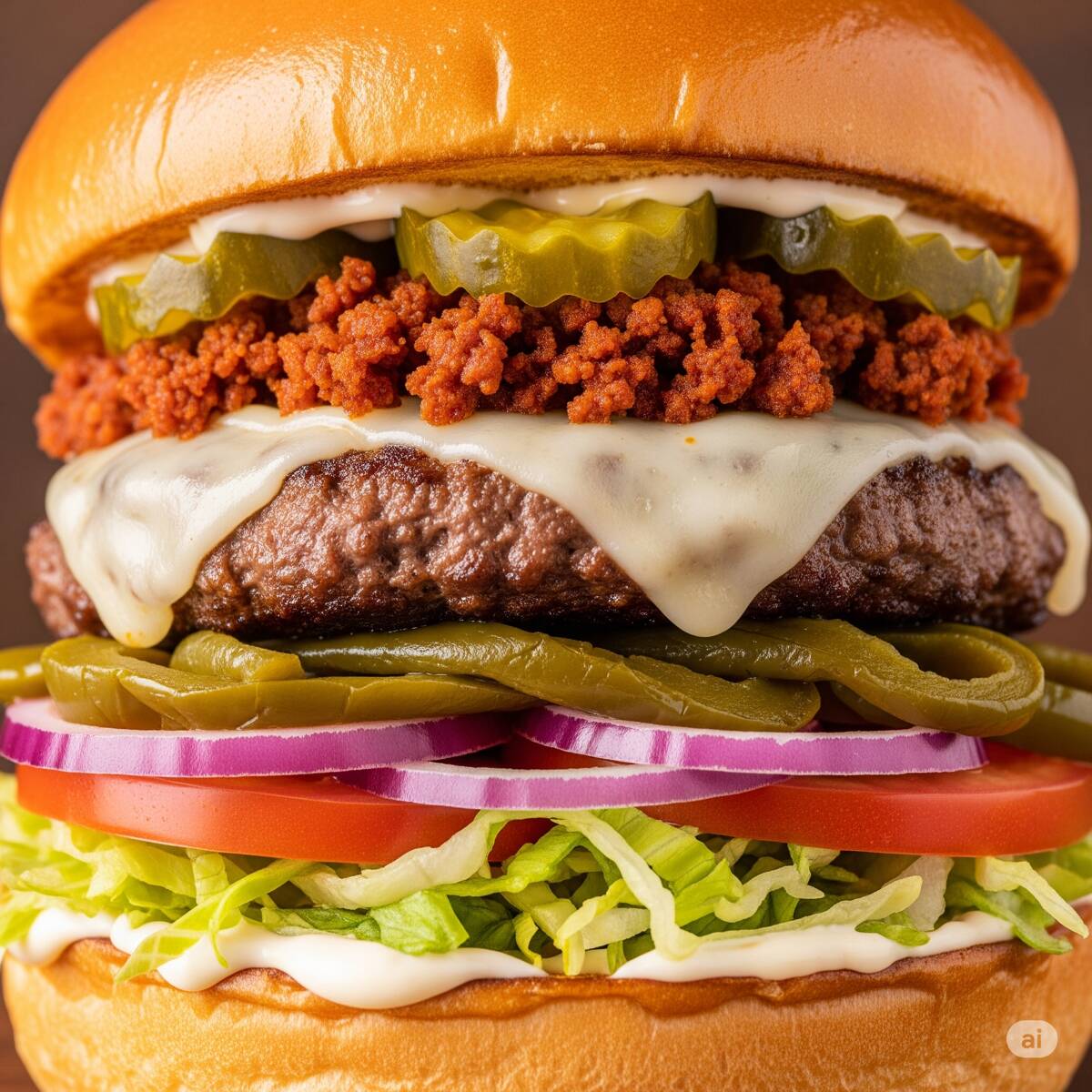 Hamburguesa con una carne de res, queso americano, chorizo, lechuga, jitomate, cebolla, rajas, pepinillos, catsup, mayonesa, mostaza.
