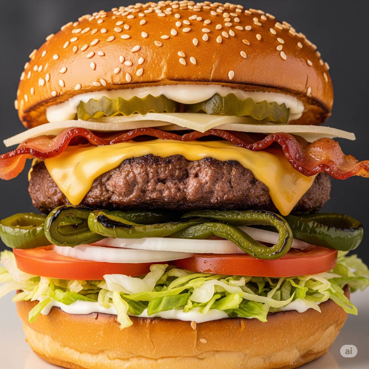 Carne de res, queso americano, tocino, lechuga, jitomate, cebolla, rajas, pepinillos, mayonesa, catsup, mostaza