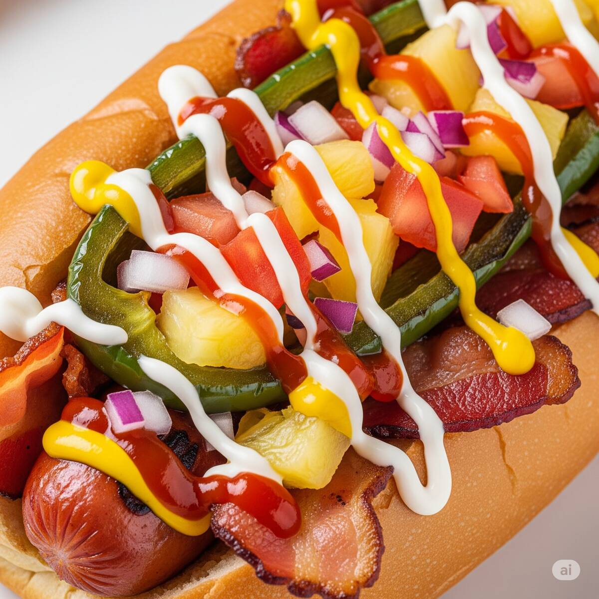 Salchicha, tocino, piña en trozos, cebolla, jitomate, rajas, mayonesa, mostaza, catsup