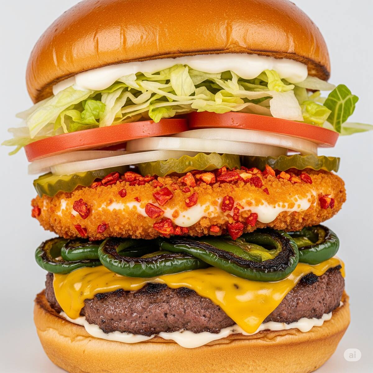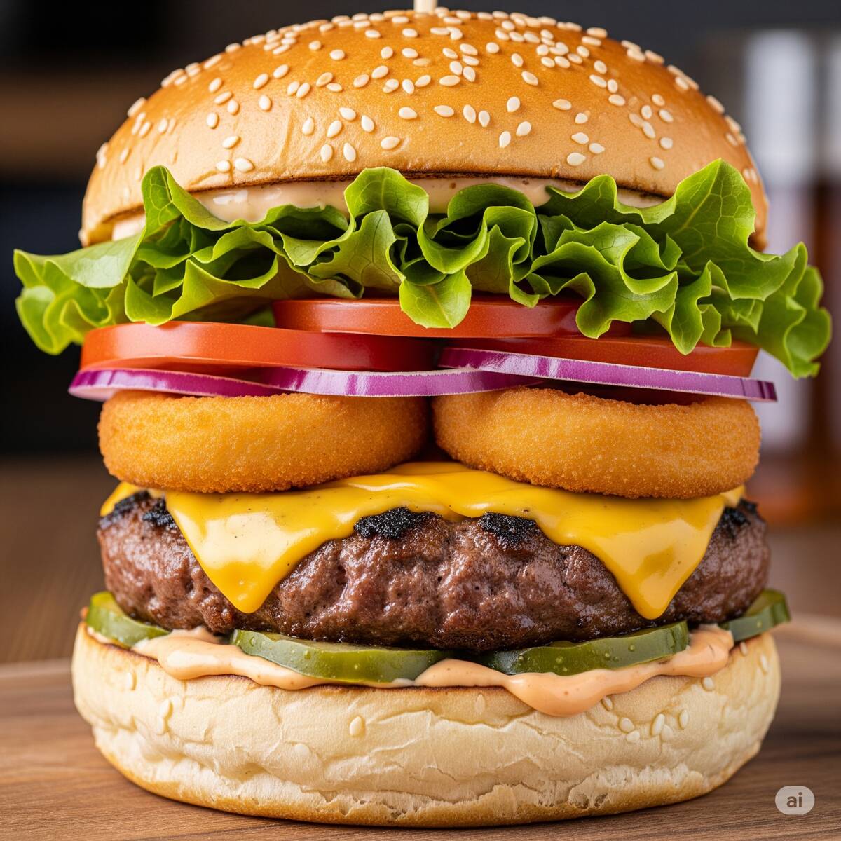 Carne, queso americano, aros de cebolla, lechuga, jitomate, cebolla, rajas, mayonesa, catsup, mostaza.