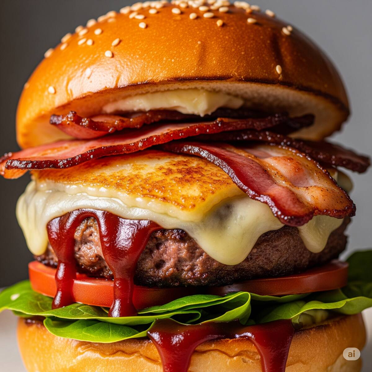 Carne, queso americano, tocino, queso manchego, salsa bbq, lechuga, jitomate, cebolla, rajas, catsup, mayonesa, mostaza.