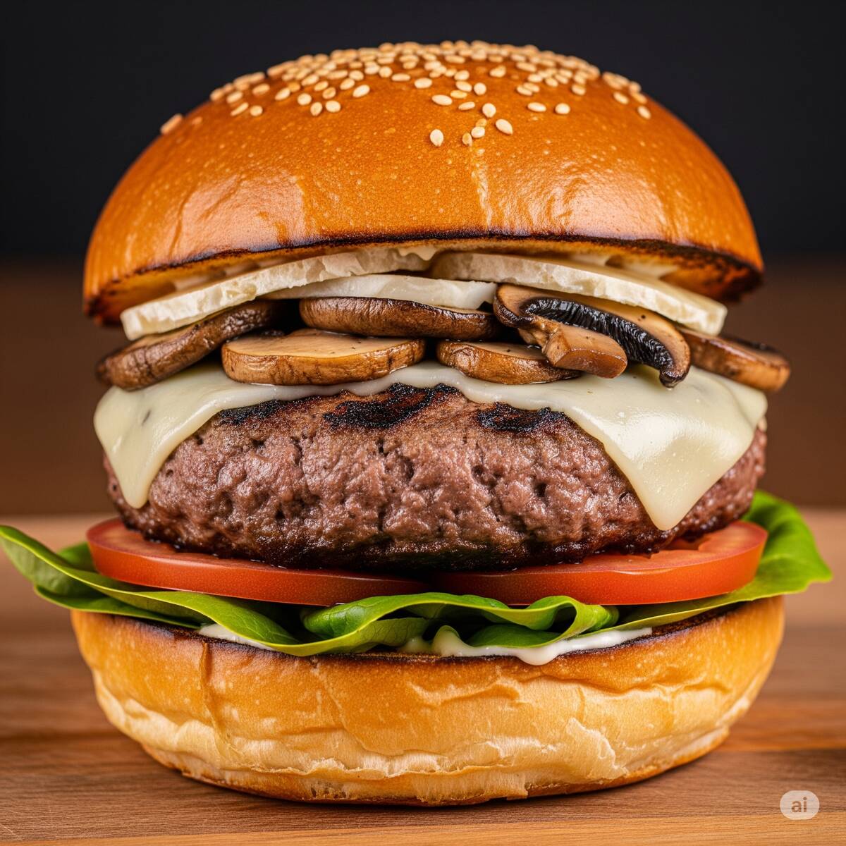 Carne de res, queso americano, champiñon, queso mozarella, jitomate, cebolla, lechuga, rajas, pepinillos, catsup, mayonesa, mostaza