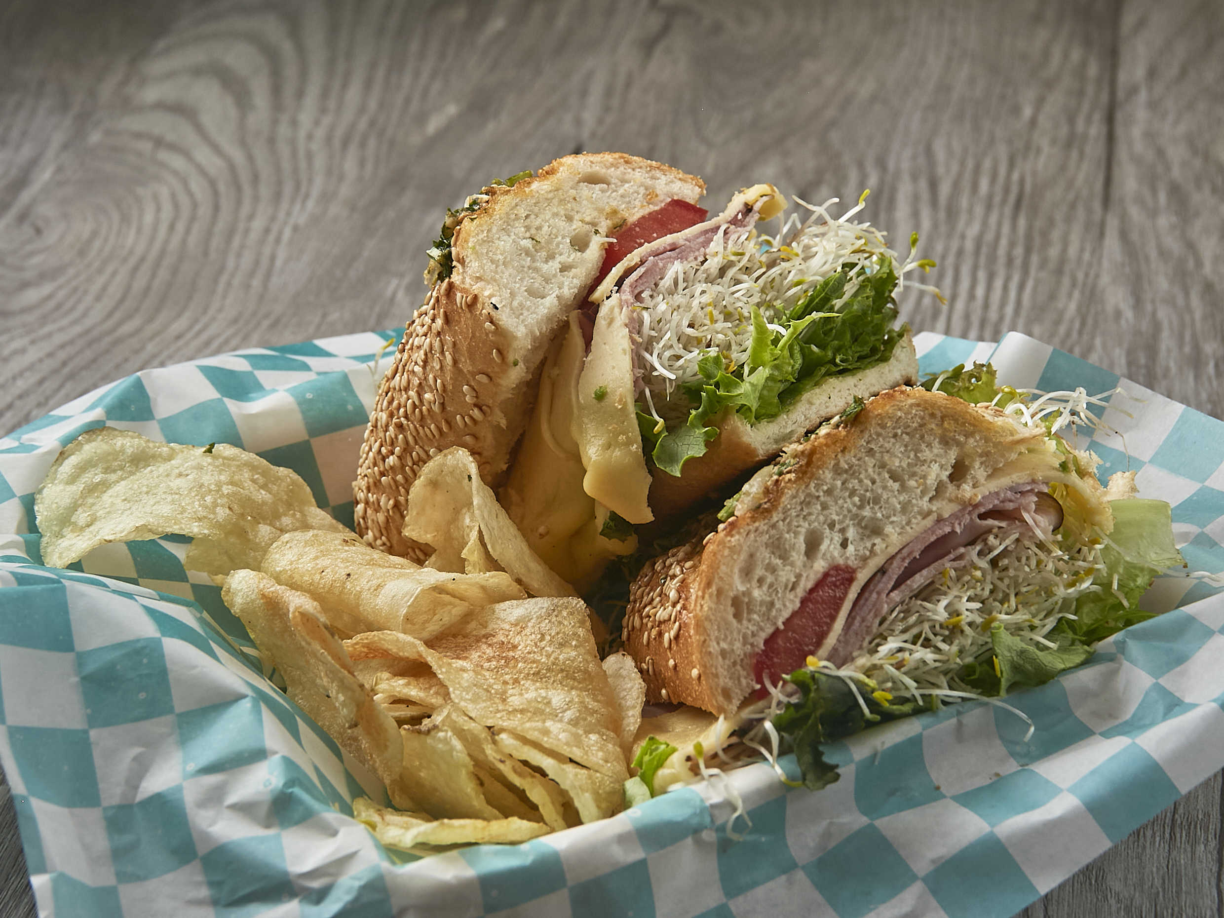 Baguette planchado relleno de queso panela, germinado, zanahoria rallada, aguacate y queso philadelphia.