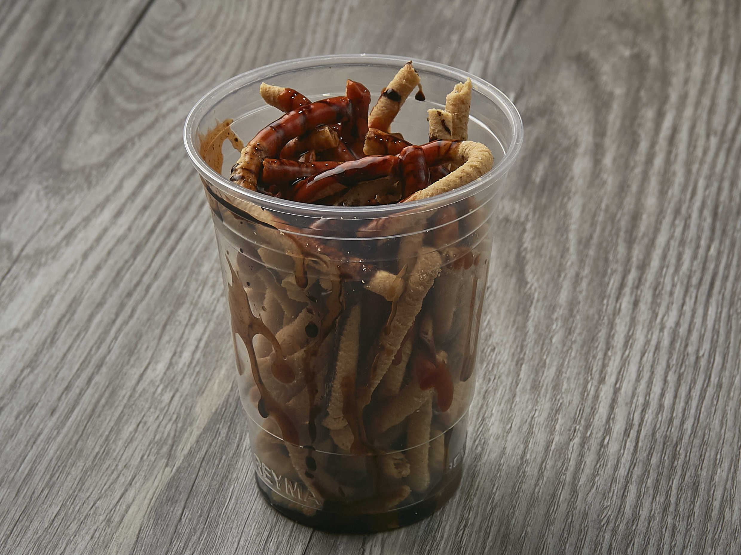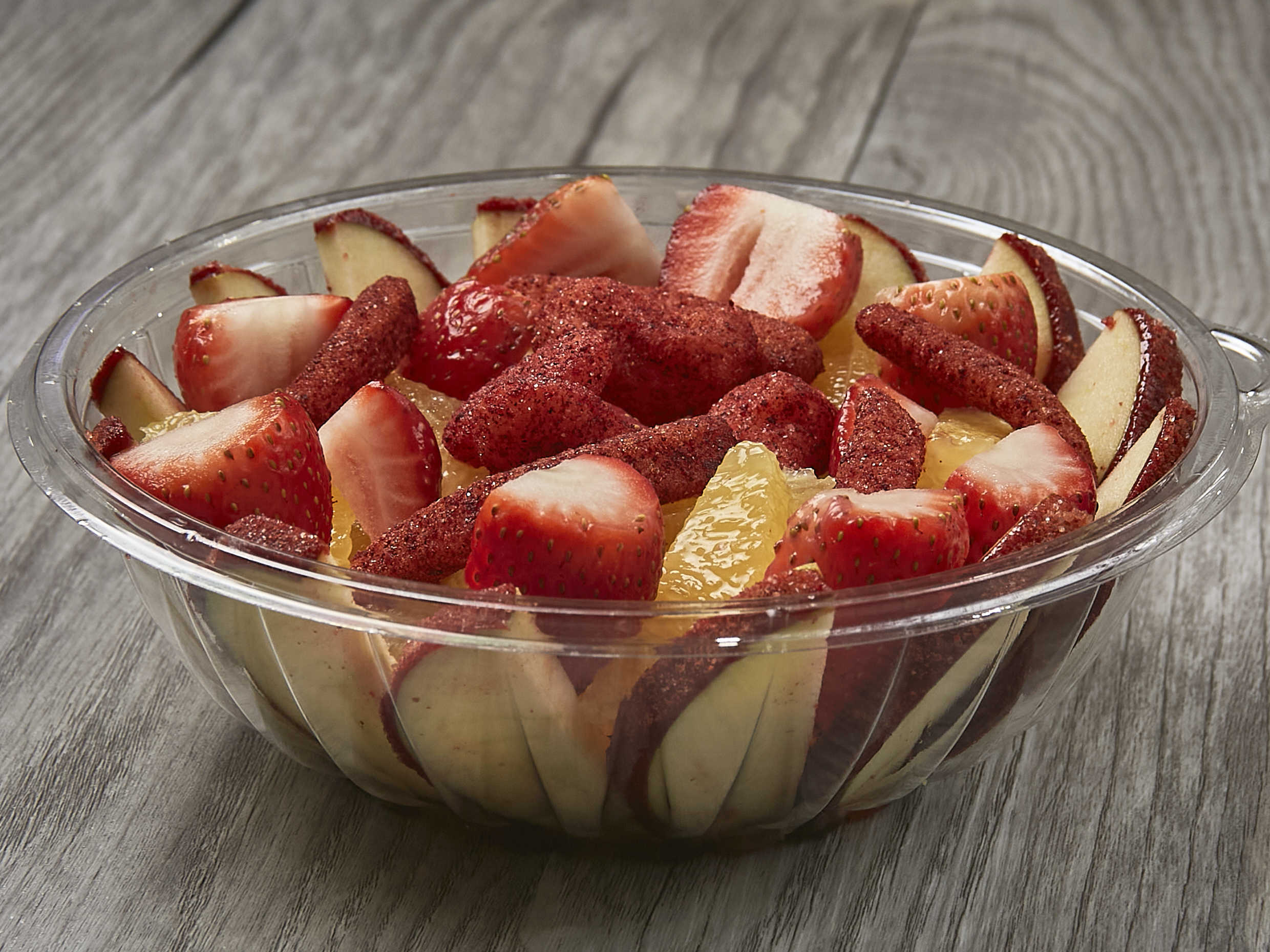 Rebanadas de manzana cubierta de tamarindo + dos frutas o verduras + chamoy y miguelito + gomitas enchiladas de mango y lombriz.