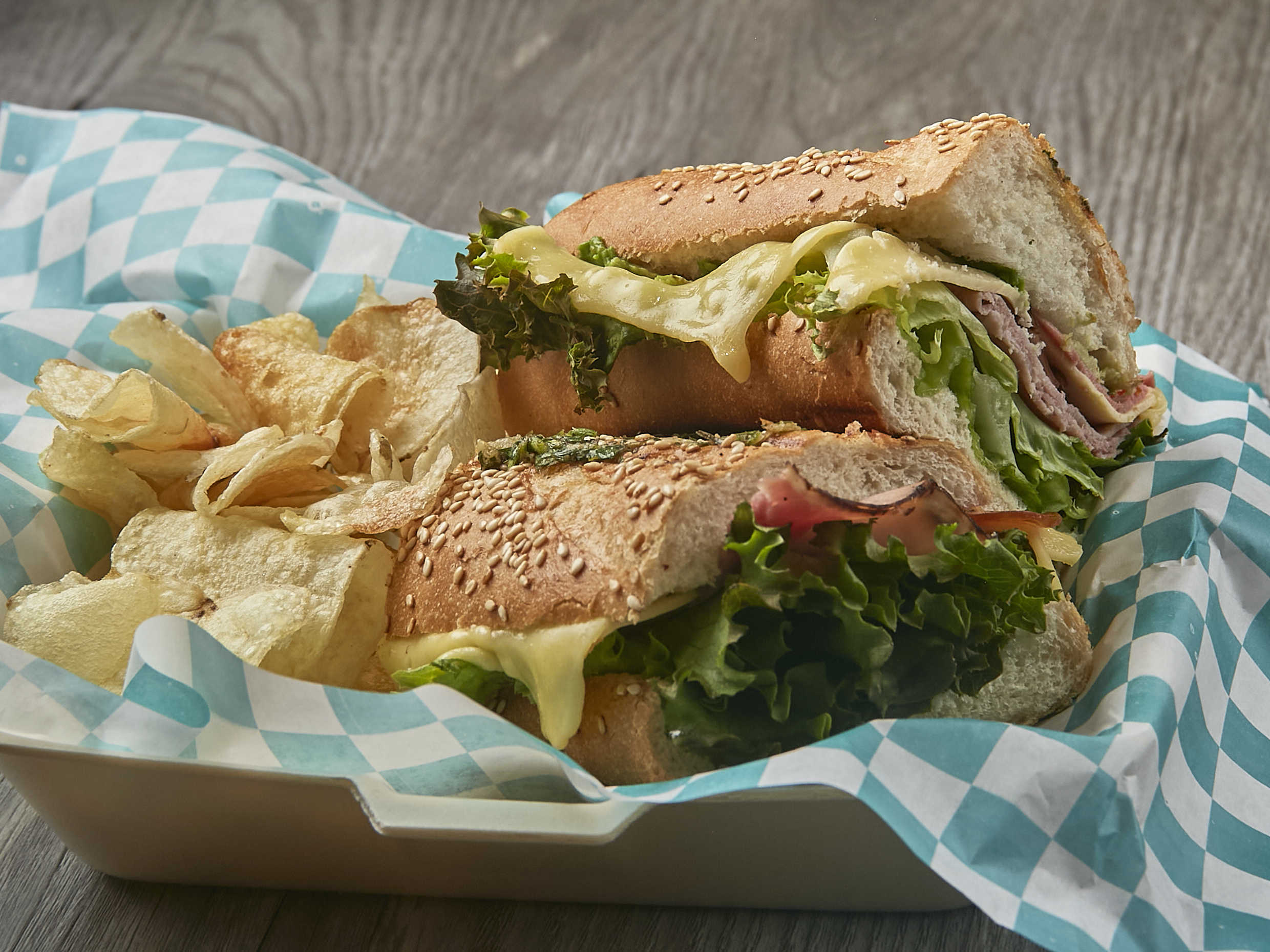 Baguette planchado, preparado con jamón de pierna horneado, queso gouda germinado, jitomate, lechuga, aderezo de la casa y chimichurri.