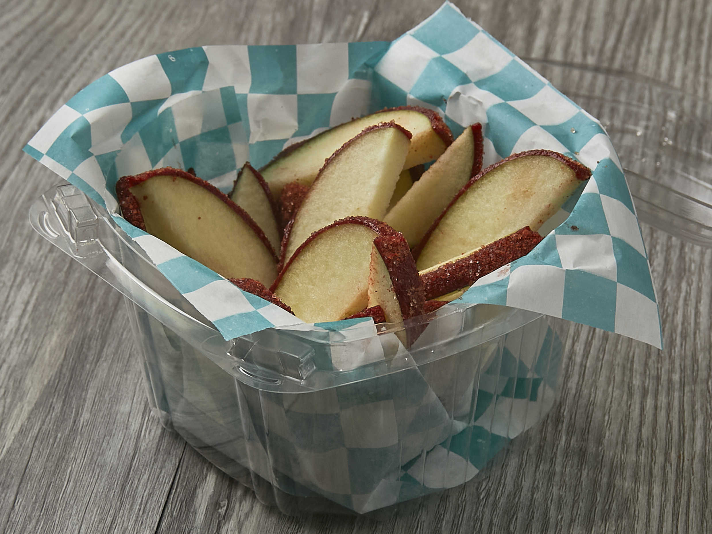Manzana cubierta de tamarindo y miguelito, va rebanada con chamoy.