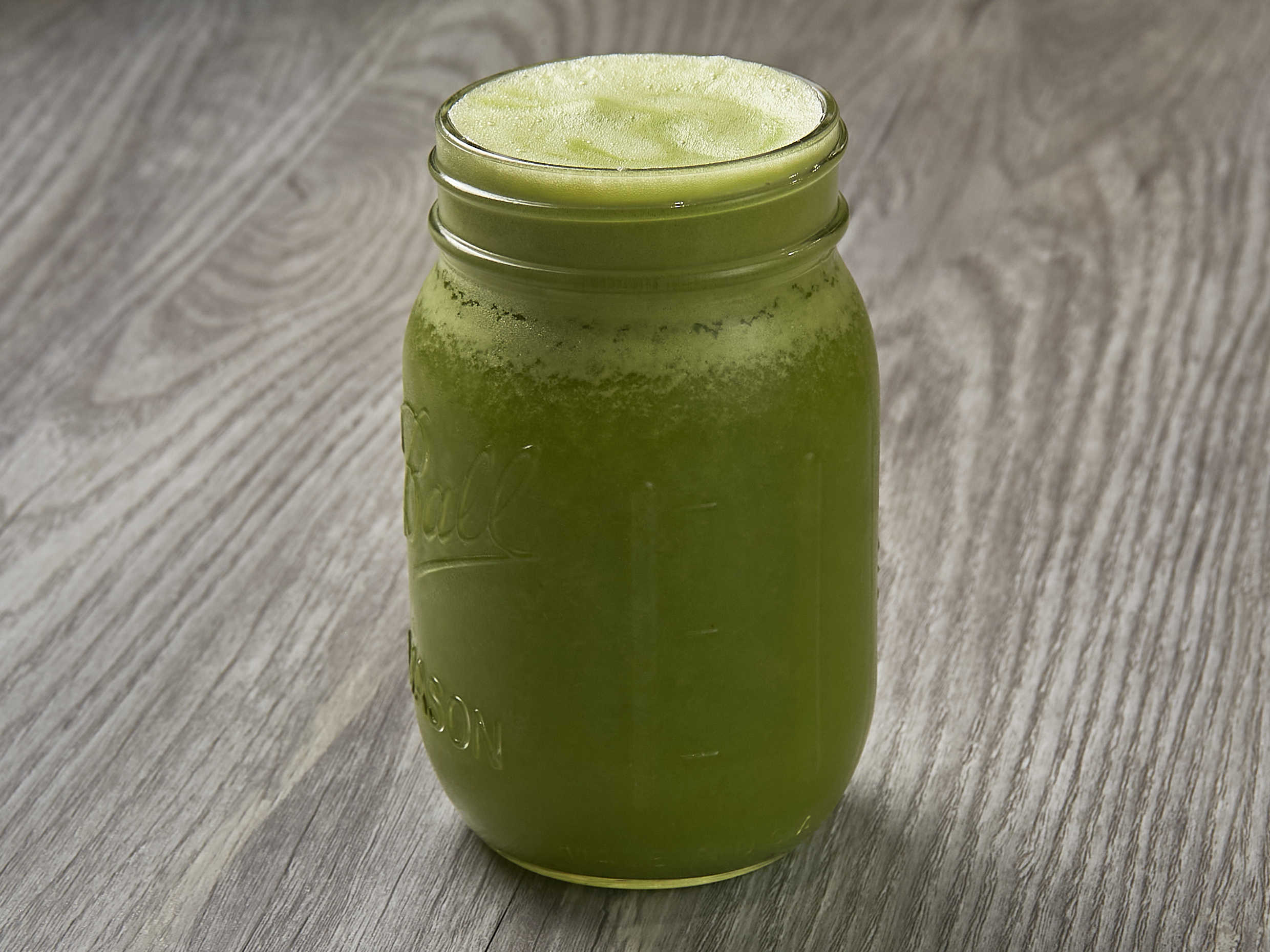 Batido hecho con pulpa de naranja, piña, perejil, nopal y apio.
