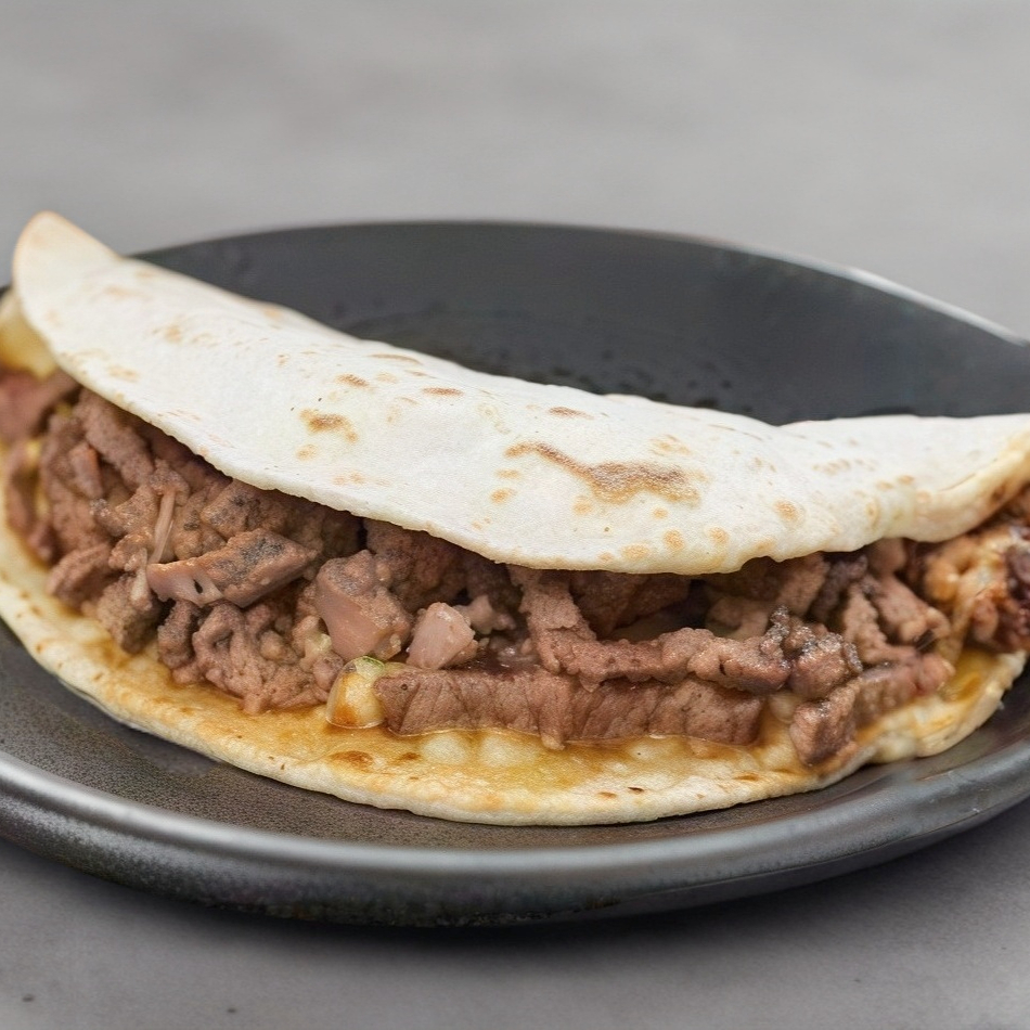 80gr de Chicharrón, 40gr de Champiñón, Quesillo, tortilla 15cm aproximados.