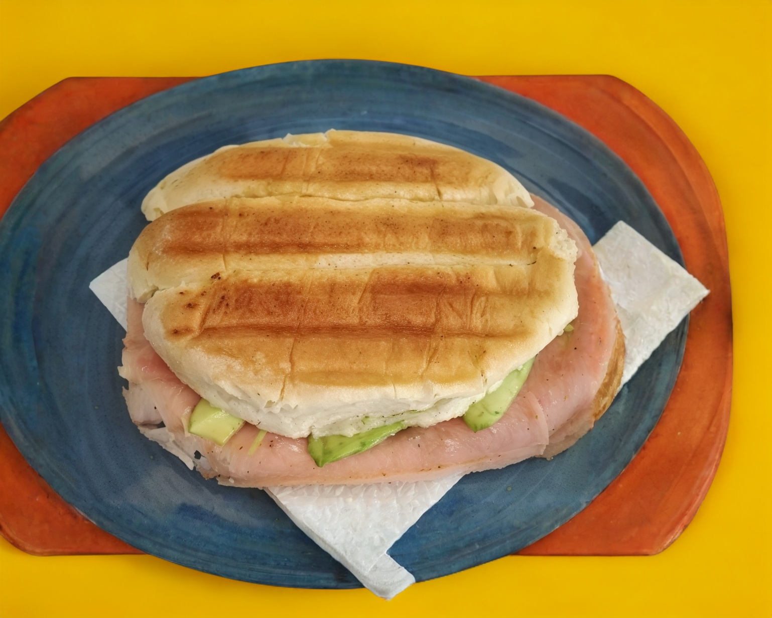 Sanwich 12 granos y semillas planchado de jamón de pierna, mayonesa, jitomate, aguacate y picante al gusto rajas caseras o chipotle