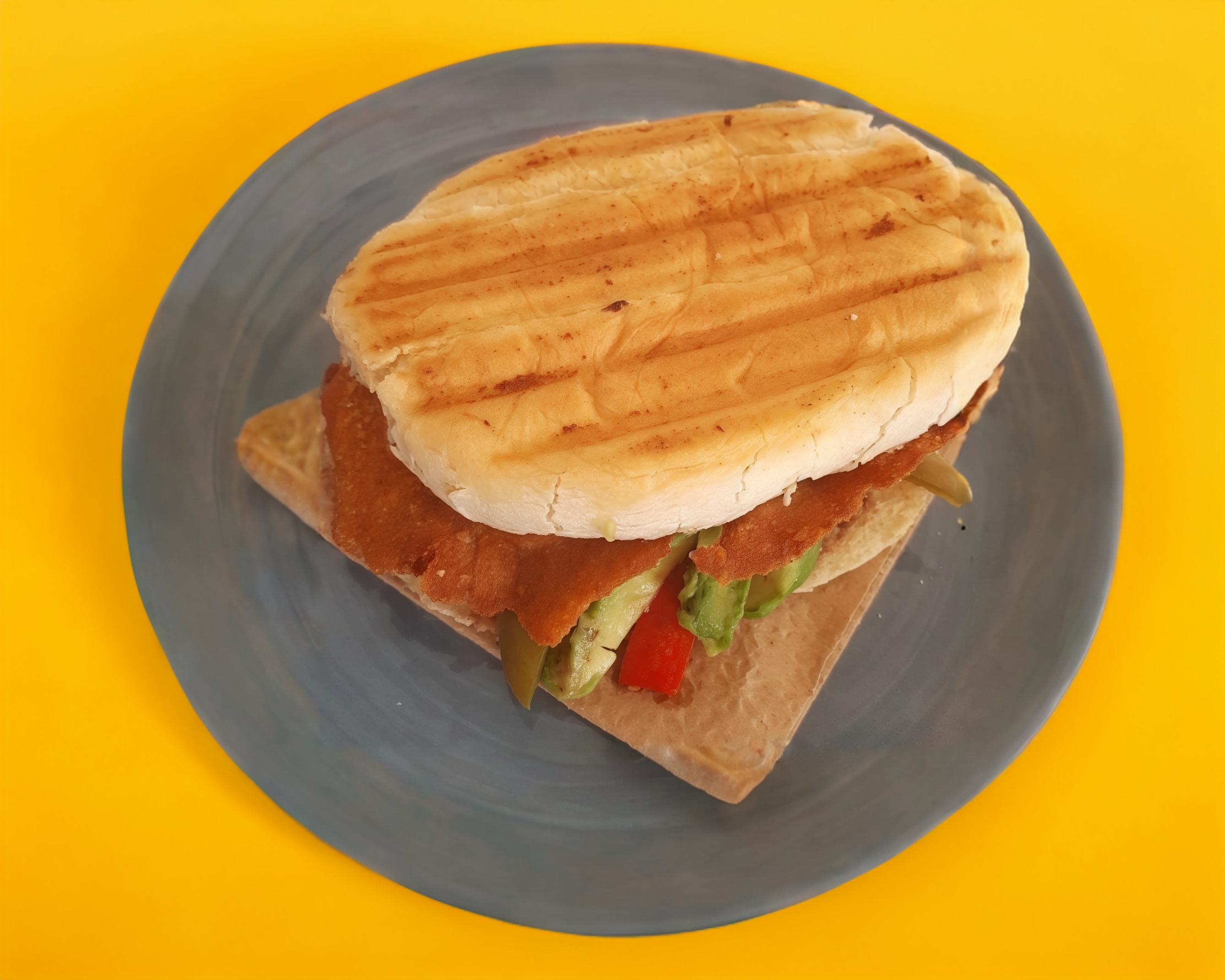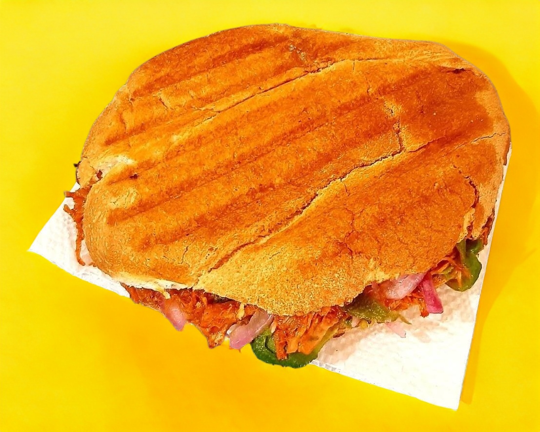 Torta planchada con 70gr de cochinita pibil, frijoles, mantequilla, aguacate y picante al gusto Habanero, Rajas caseras o chipotle casero