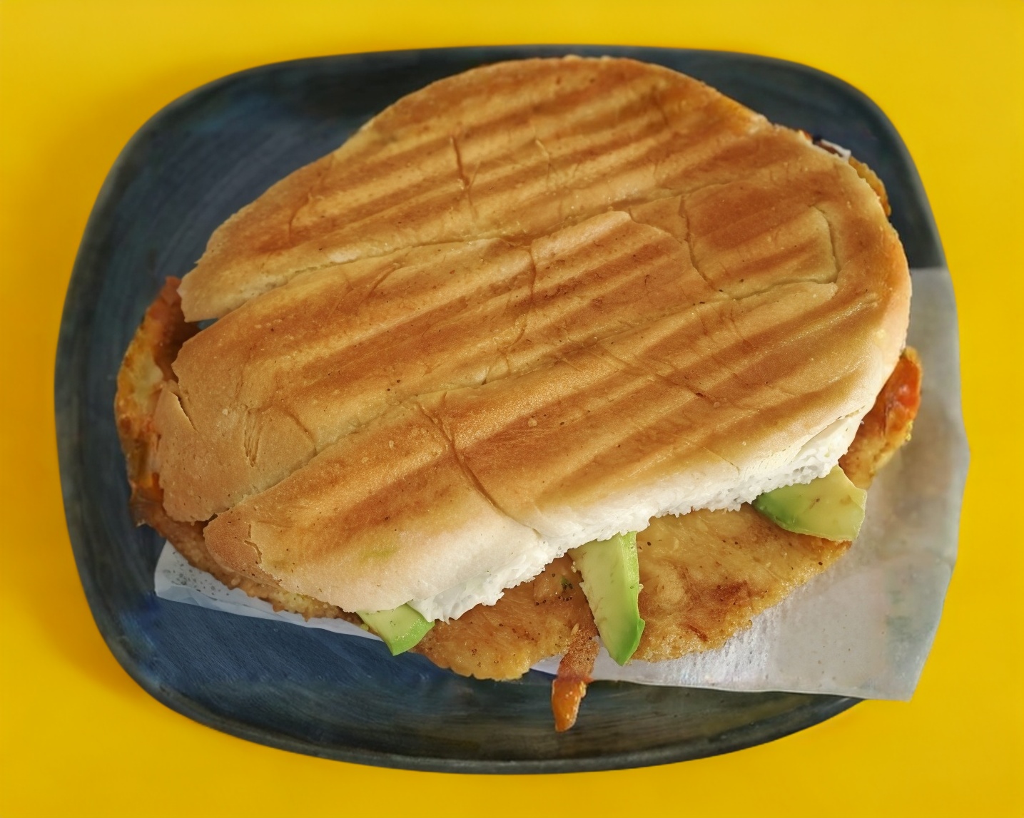 Torta planchada de milanesa de Pollo, frijoles, aguacate y mantequilla picante al gusto Rajas caseras o Chipotle 70 gramos aproximadamente