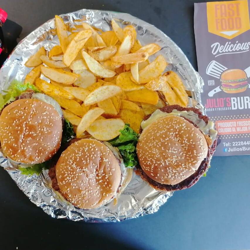 3 Hamburguesas con orden chica de papas (Puede agregar refresco por $ accesible )