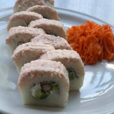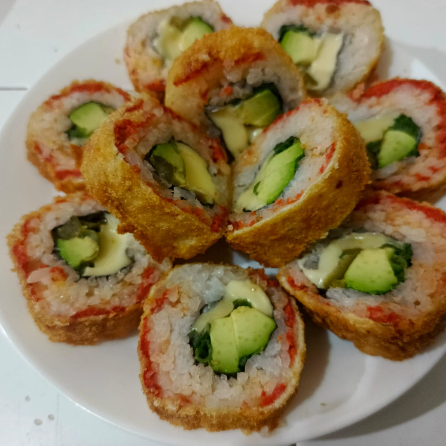 Queso crema, surimi, aguacate, Chipotle. Camarón empanizado,alga.
