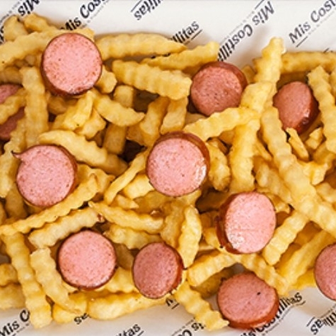 Papas francesas, salchicha, salsa ,catsup ,queso amarillo.