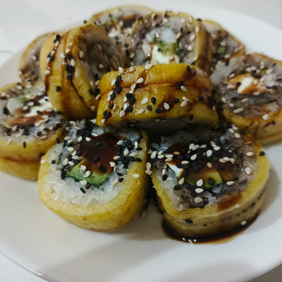Queso crema,surimi, pepino, aguacate, plátano macho frito, ajonjoli.