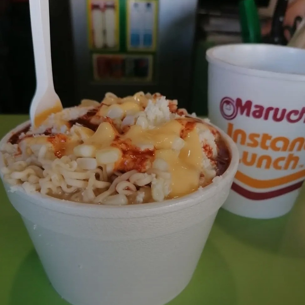 Maruchan, esquites, mayonesa, queso añejo, queso amarillo, limón, salsay salsa.