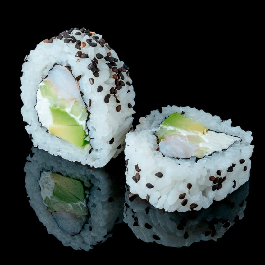 Pepino, aguacate, queso crema, surimi, ajonjolí negro