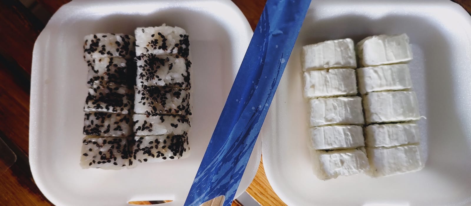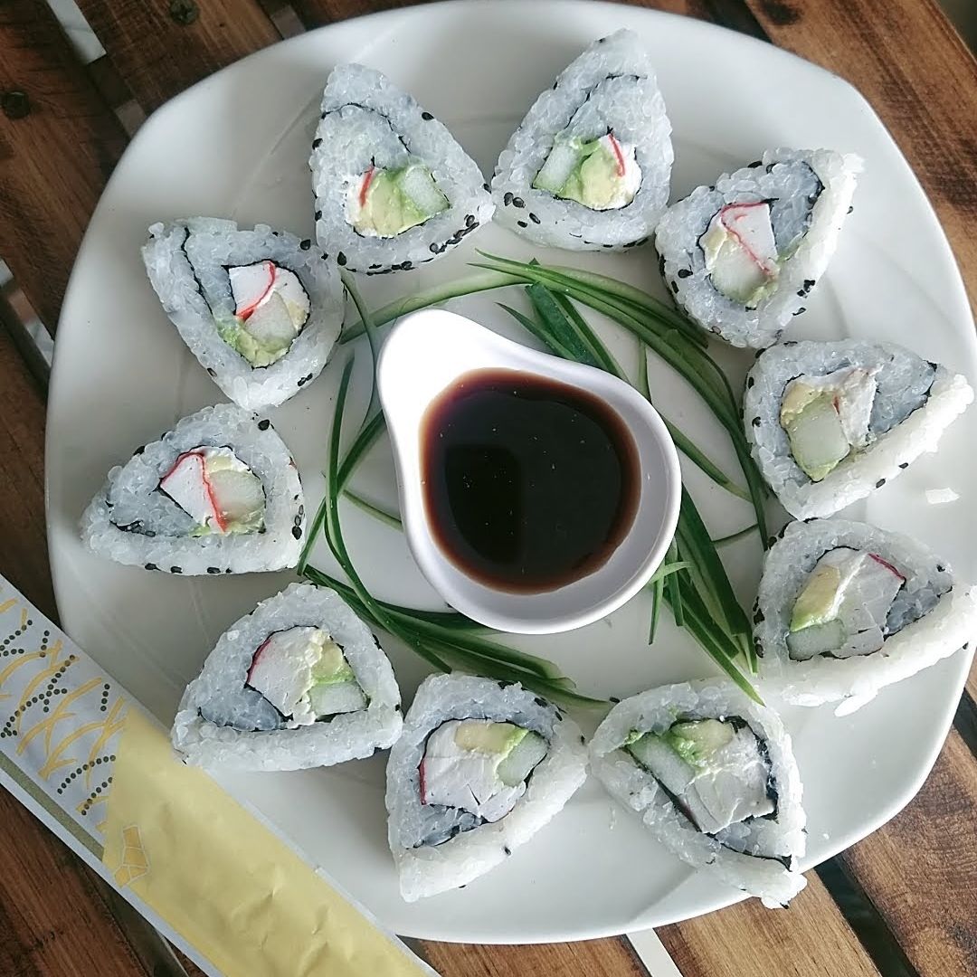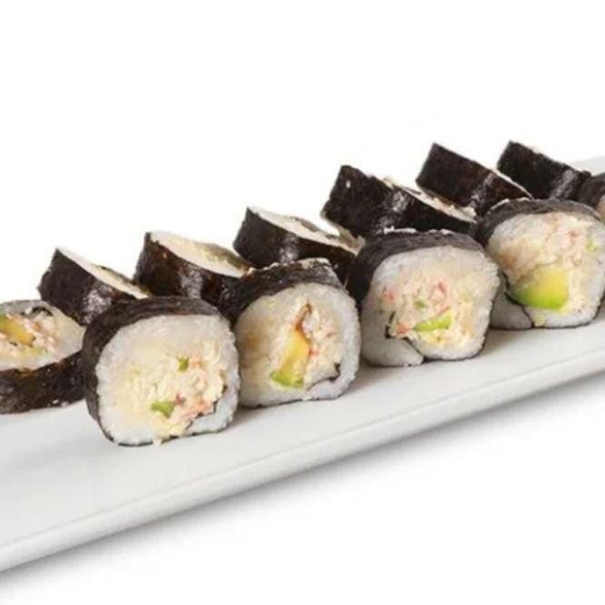 Dentro pepino, aguacate, surimi, fuera queso Philadelphia y ajonjolí.