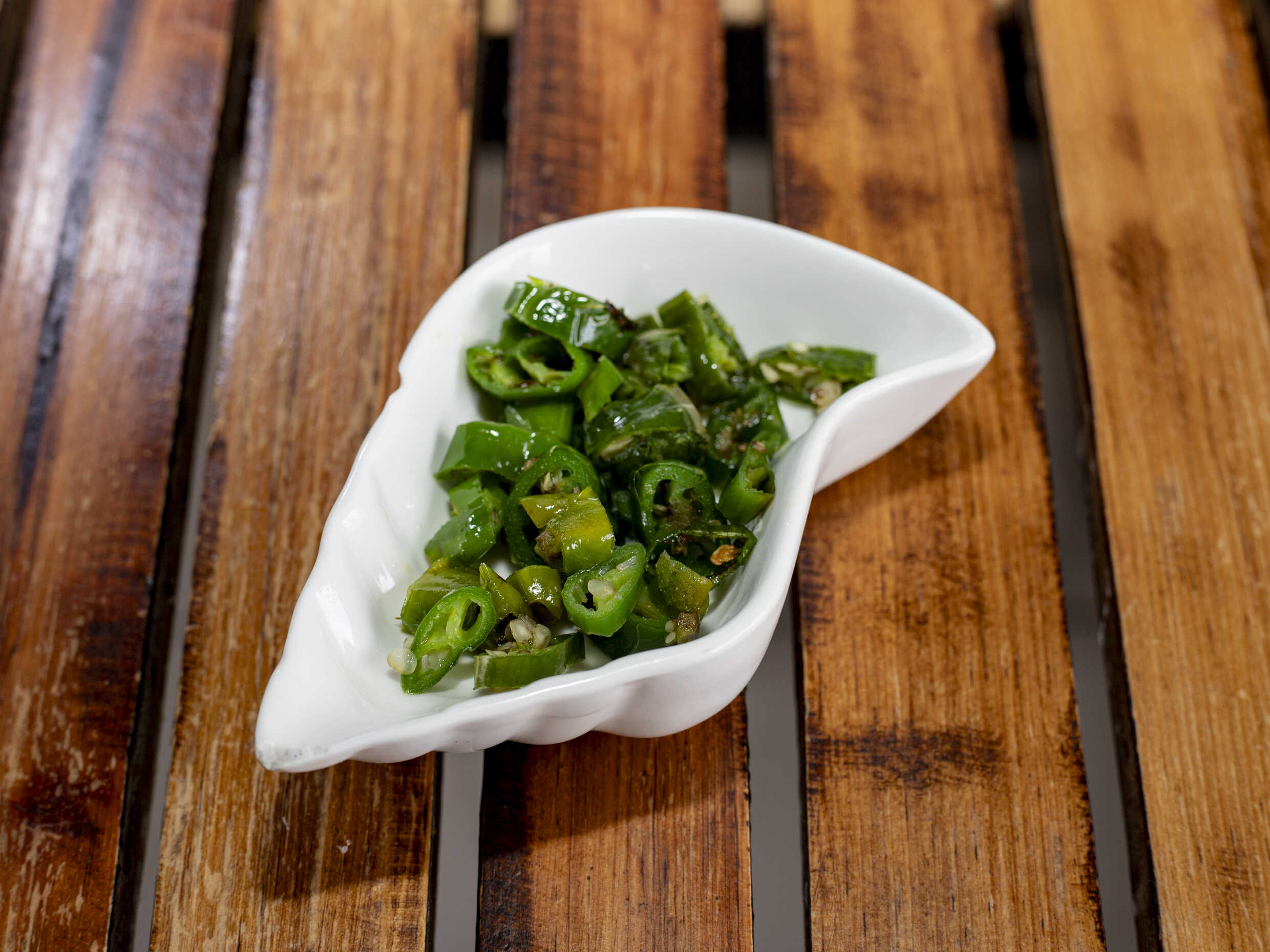 Dentro surimi, aguacate, chiles toreados, fuera manchego y chorizo.