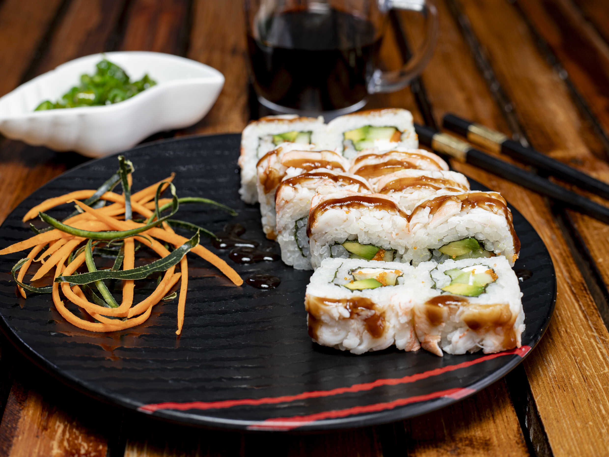 Dentro pepino, masago, aguacate, Philadelphia, fuera capeado, camarón y salsa de anguila.