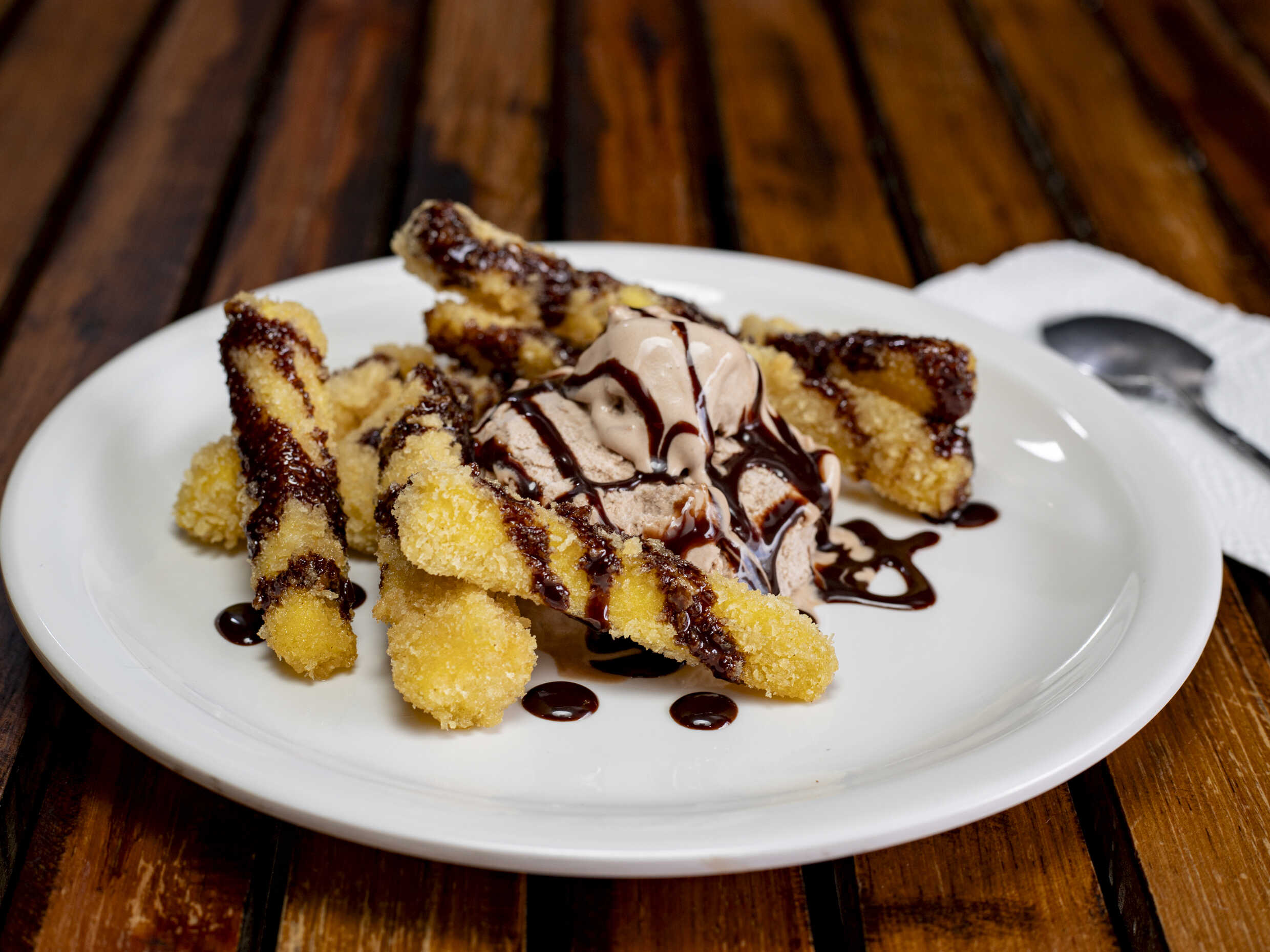 Plátano capeado, acompañado de helado bañado en salsa a su elección.