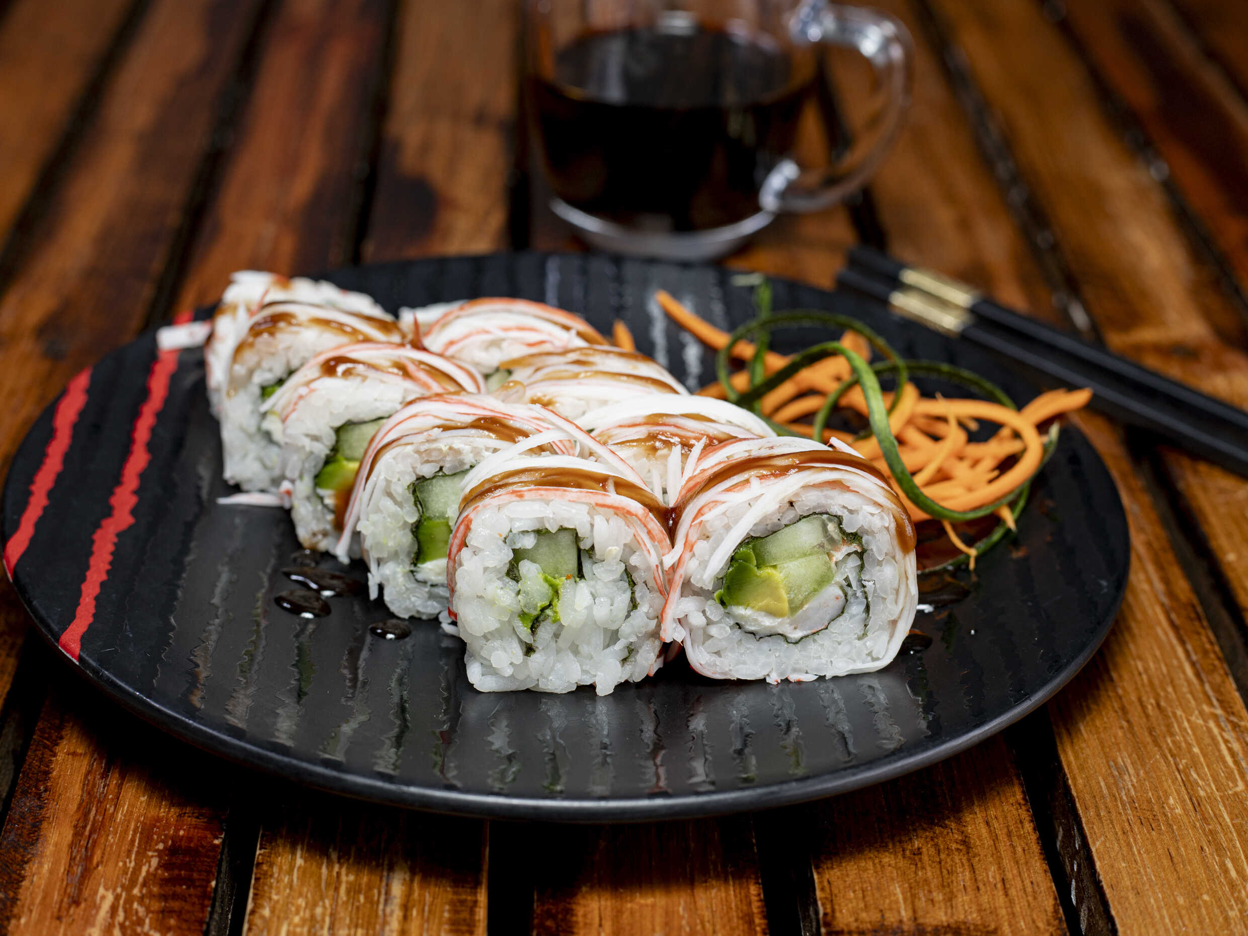 Dentro pepino, camarón, aguacate, Philadelphia, fuera kanikama y salsa de anguila.