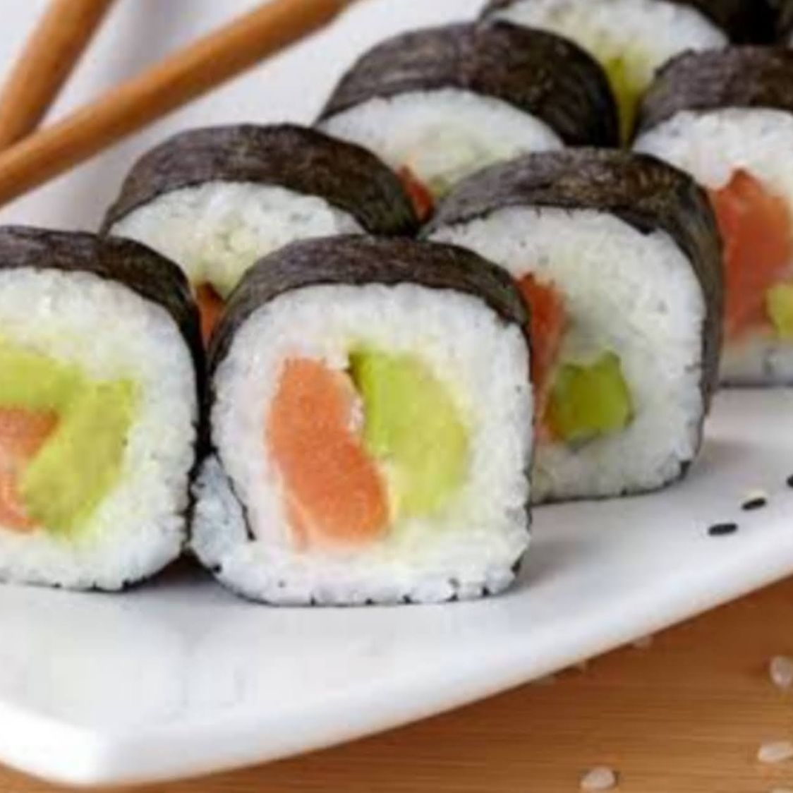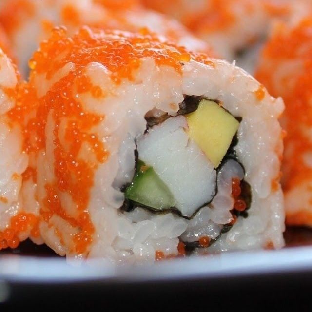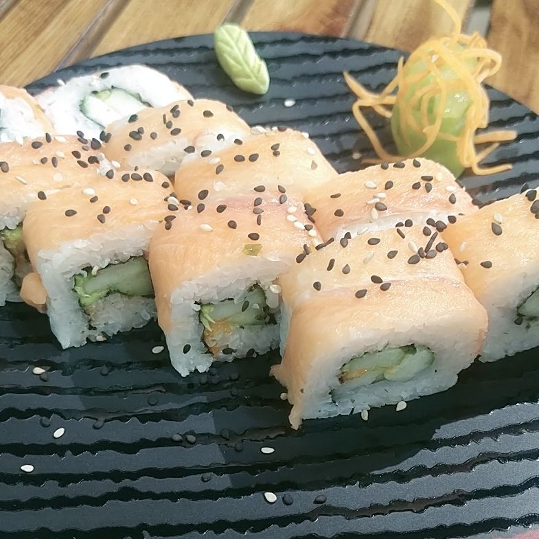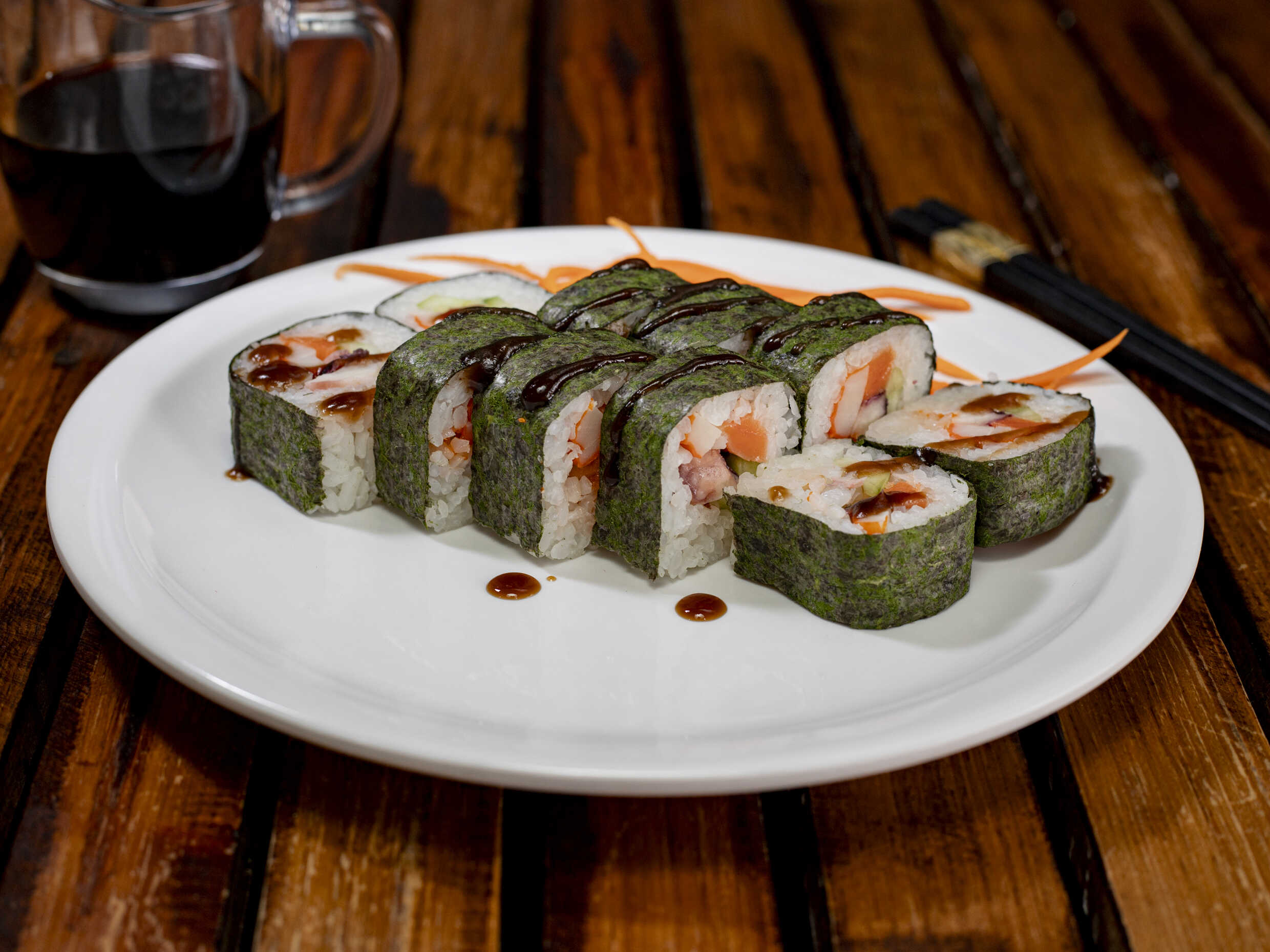 Dentro pepino, camarón, salmón, pulpo, surimi, robalo, masago, fuera alga y salsa de anguila.
