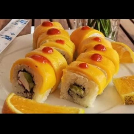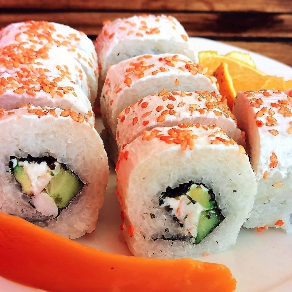 Dentro surimi, pepino, aguacate, fuera Philadelphia, masago y pasta tampico.