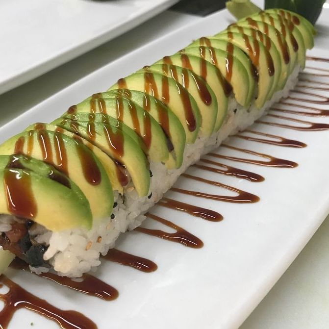 Dentro pepino, camarón, aguacate, Philadelphia, fuera aguacate y salsa de anguila.