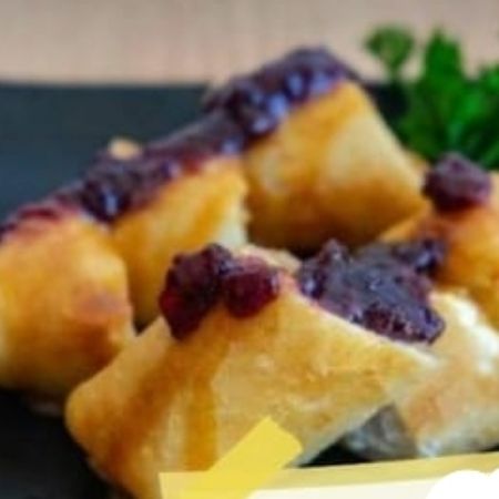 Rollitos de tortilla de arroz frito, rellenos de Philadelphia, cajeta y mango, bañado en zarzamora.