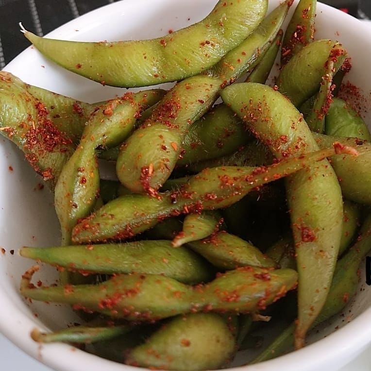 Vainas de soya, acompañado de limón y sishimi togarashi.