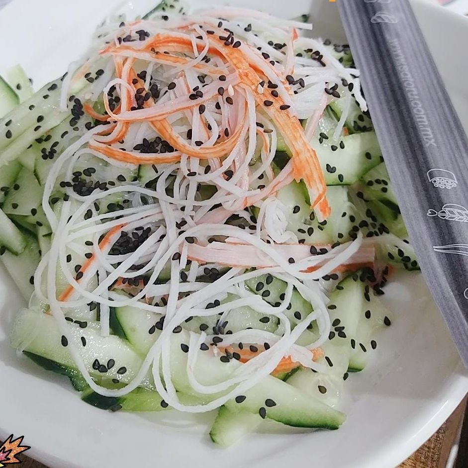 Pepino curtido, pasta lluvia de primavera, kani kama, ajonjolí negro, bañado en vinagreta de la casa.