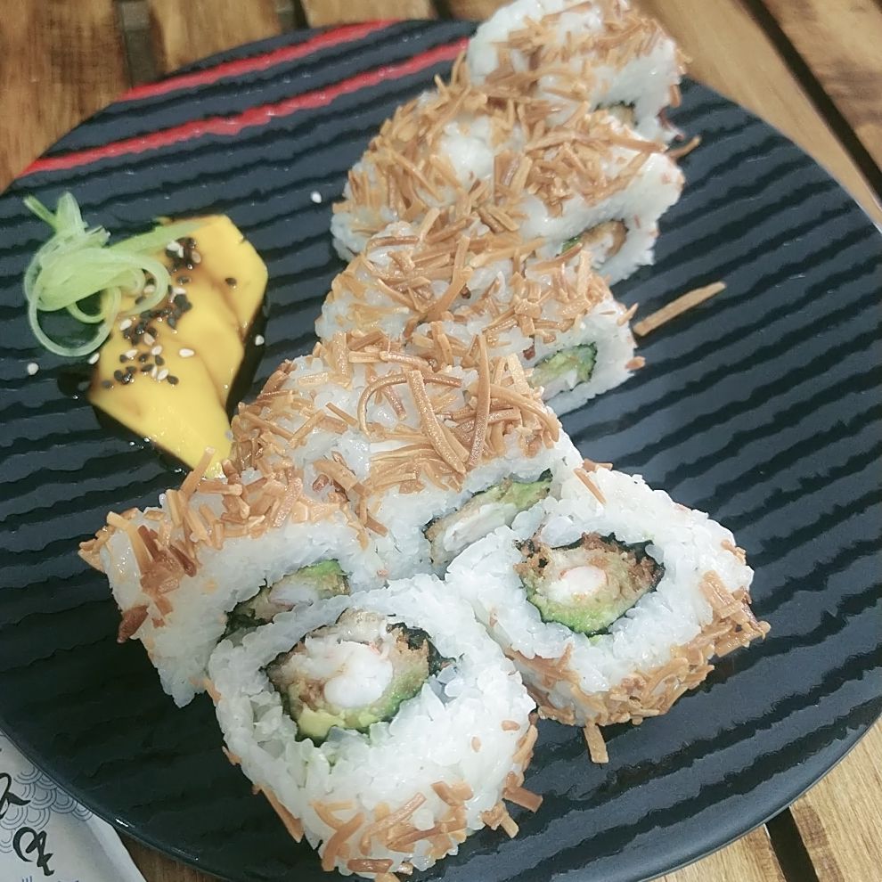 Dentro camarón empanizado, aguacate, Philadelphia, fuera kanikama frito y pasta tampico.