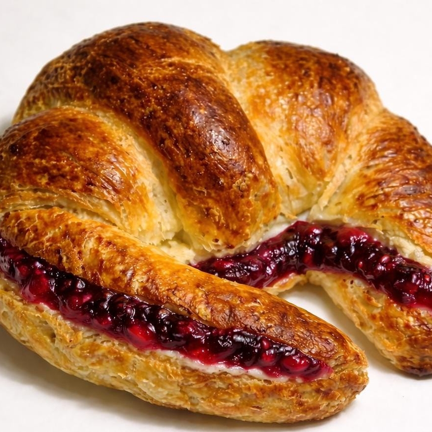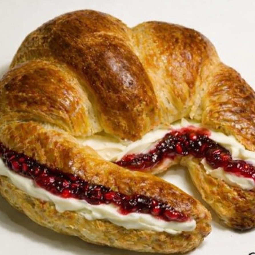 Cuernito dulce relleno de queso Philadelphia y compota de frutos rojos