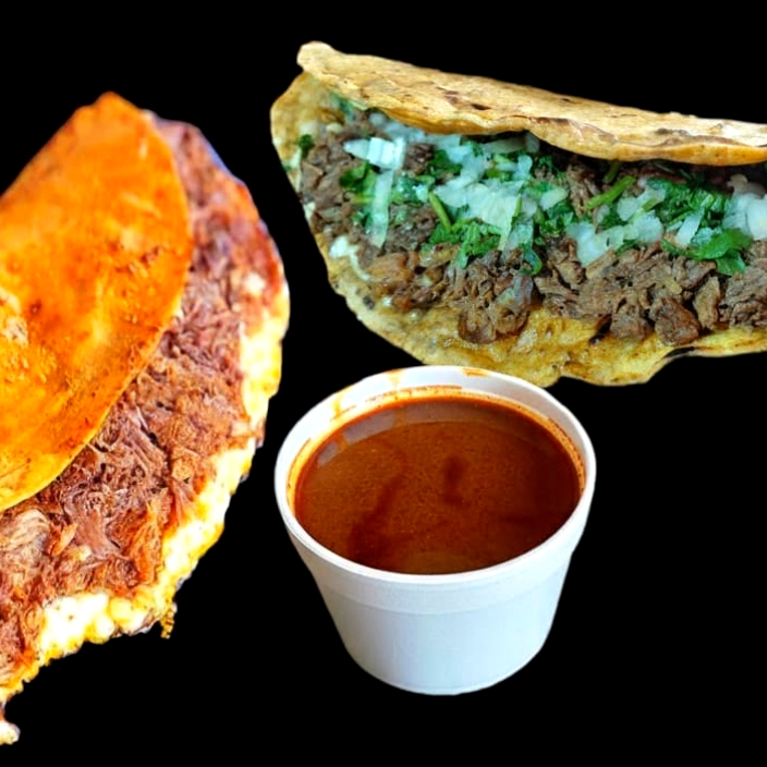2 Tortillas de maíz doradas a la plancha con carne de birria, queso fundido, cilantro, cebolla, limones y salsas.
