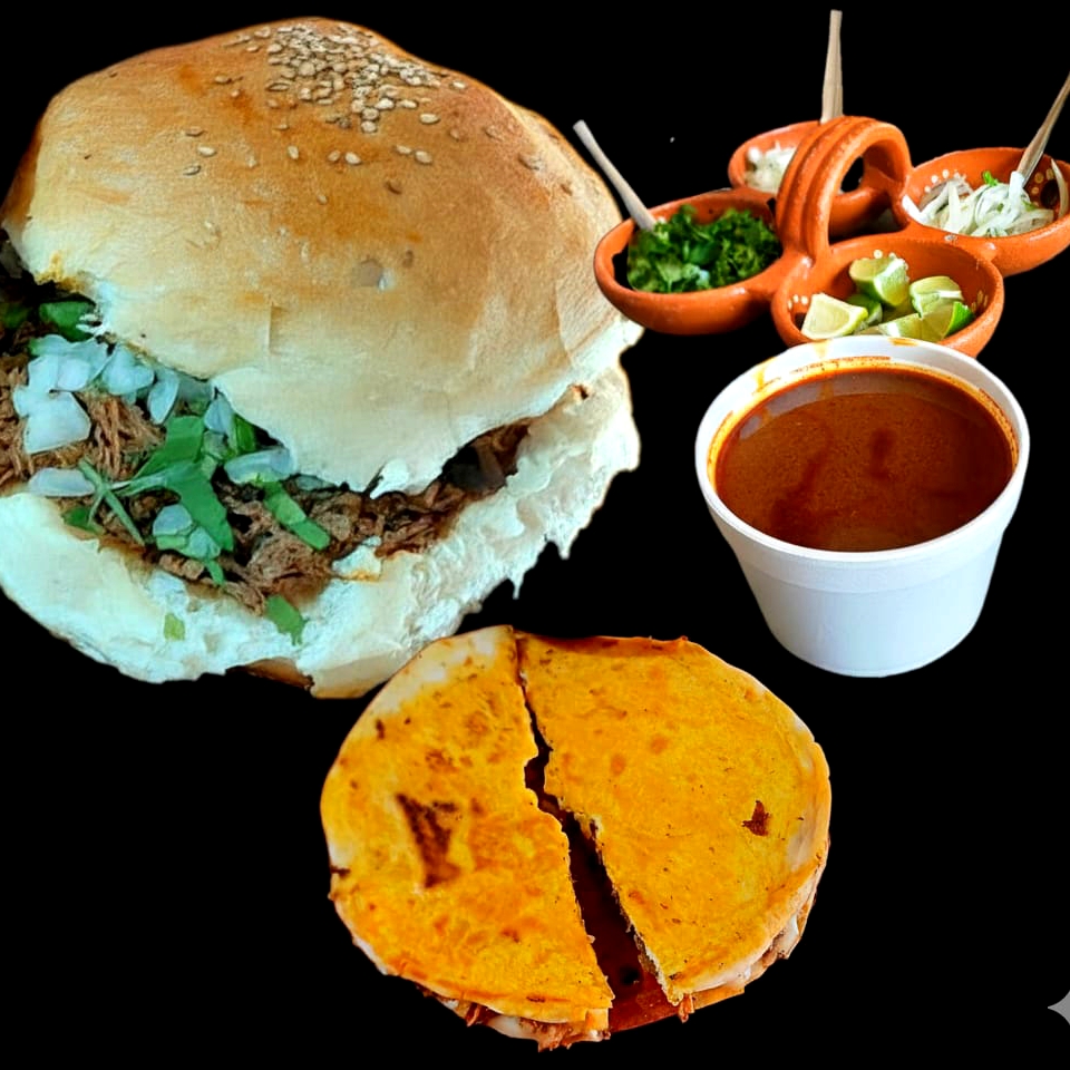 1/2 kilo de carne de birria, 1 litro de consomé, tortillas, cemita, cebolla, cilantro, limones y salsas.