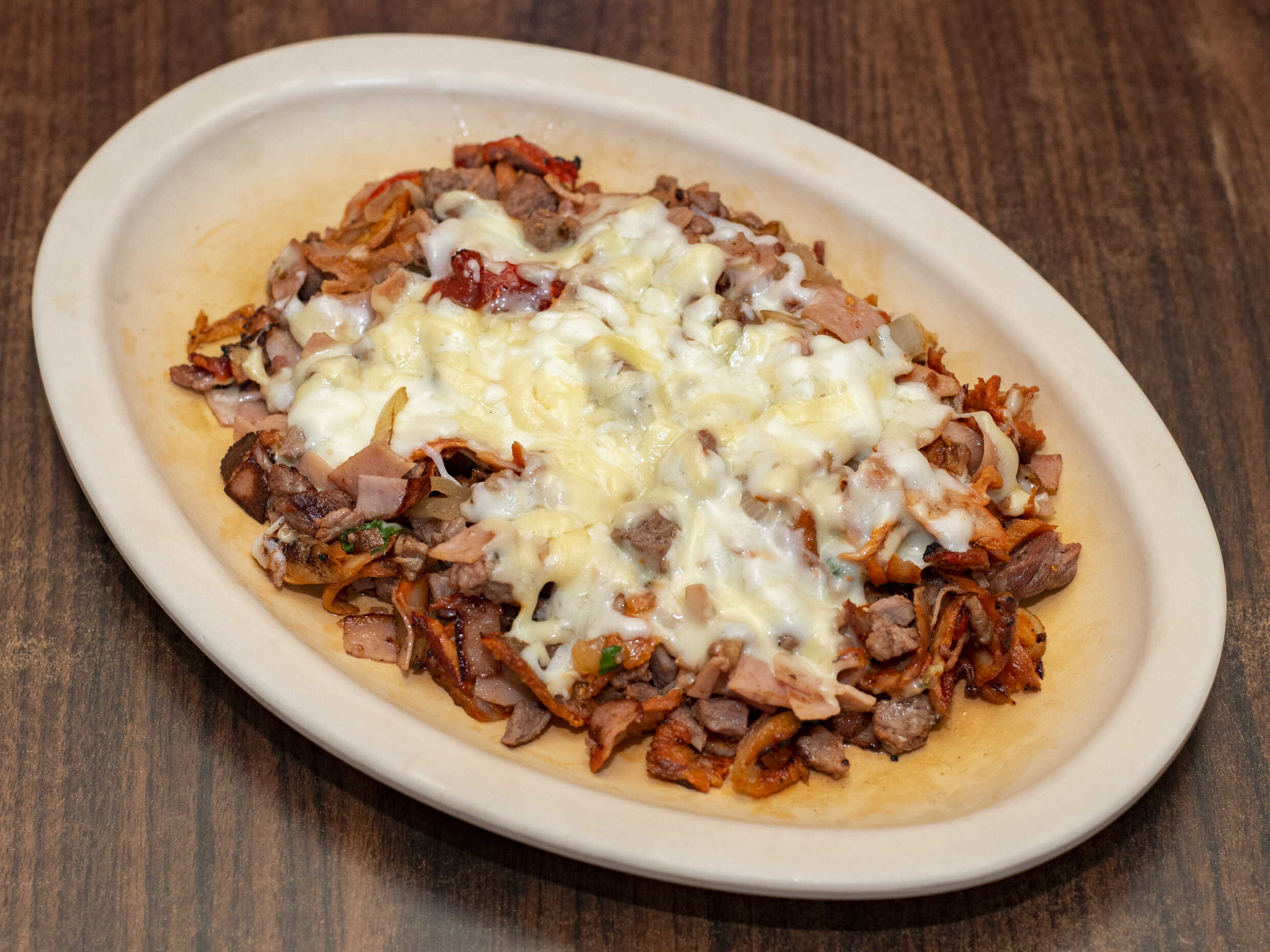 BISTEC DE RES, PASTOR, TOCINO, JAMON, LONGANIZA, CEBOLLA Y QUESO AL GRATIN