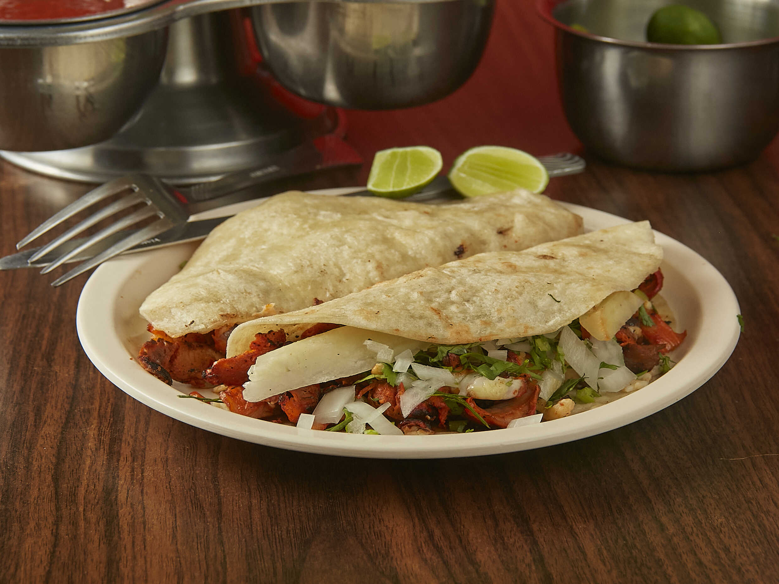 Kilo de carne con 38 tortillas de maíz, 8 tortillas de harina, salsas, limones y verdura.
