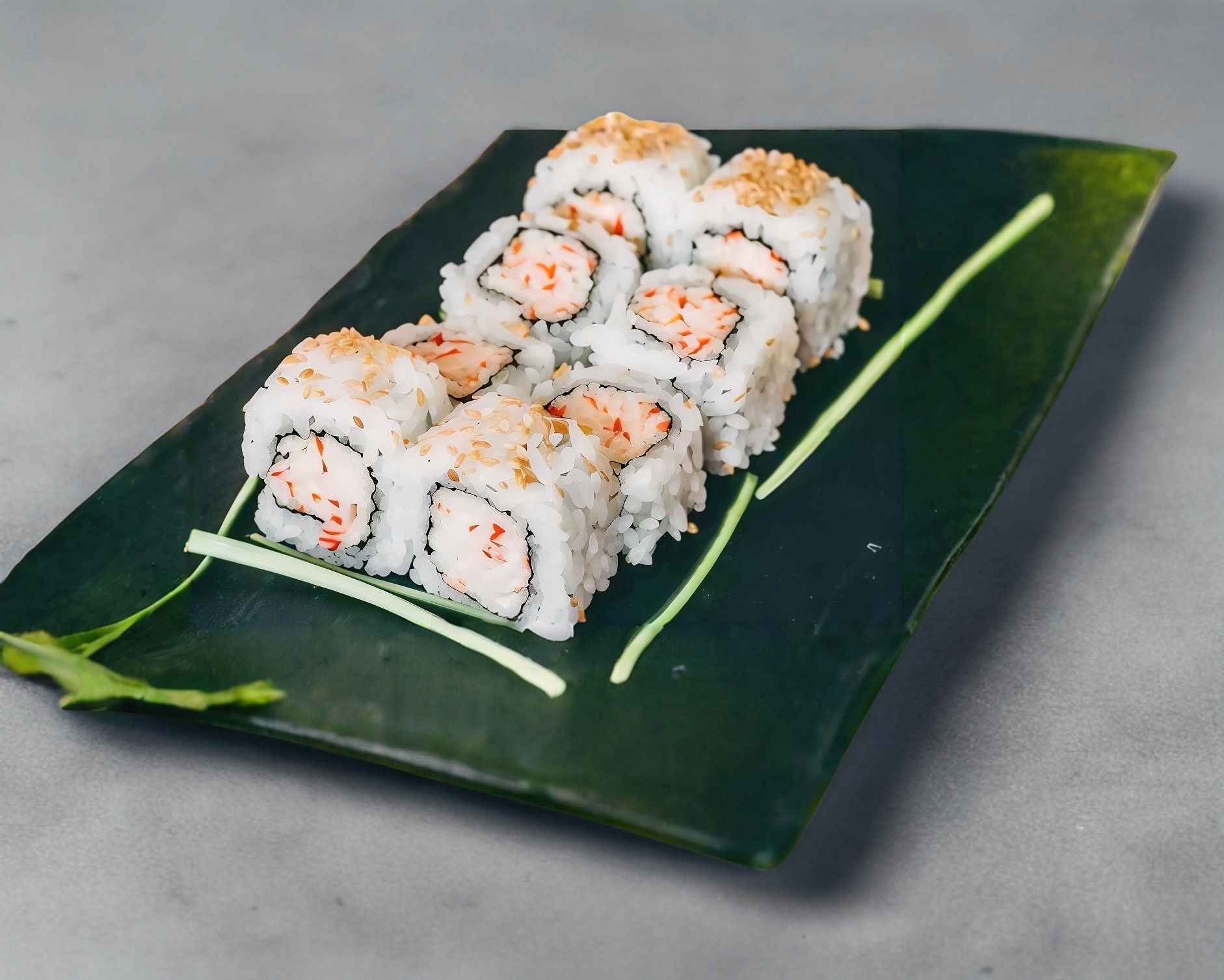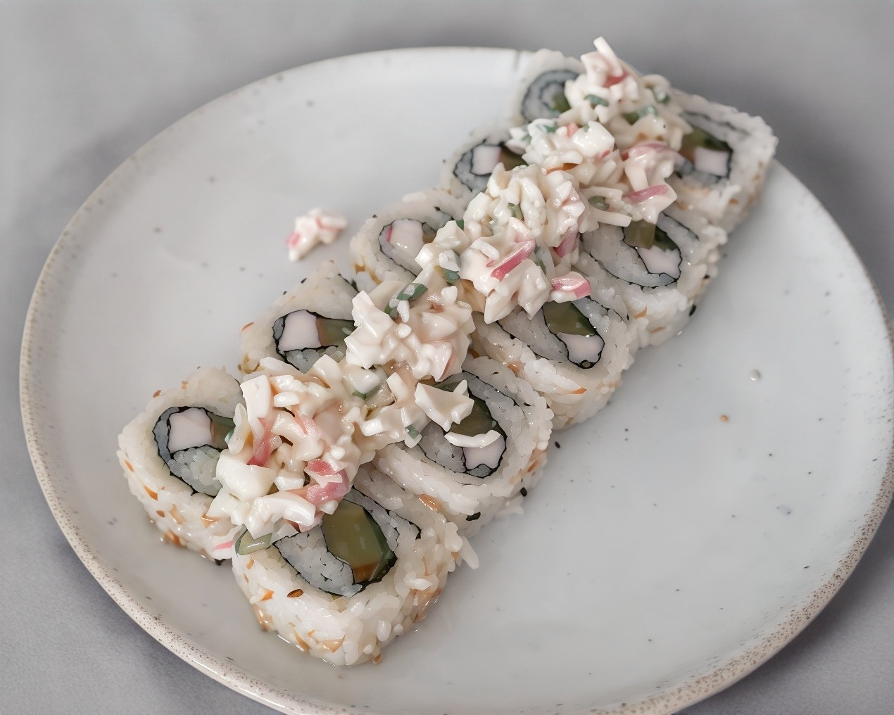 Arroz 200 g, queso 50 g, pepino 50 g, surimi 50 g y sésamo negro 20 g.