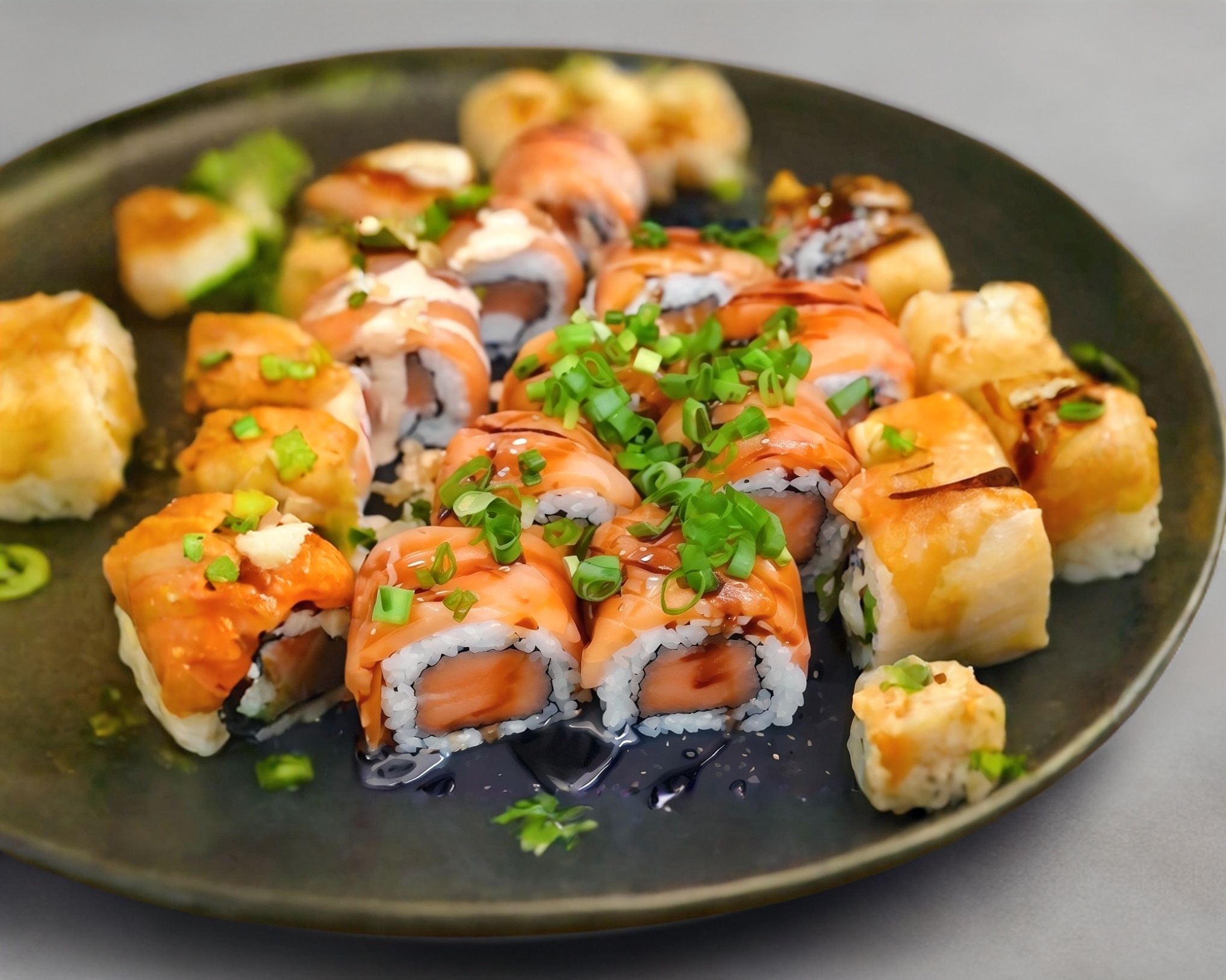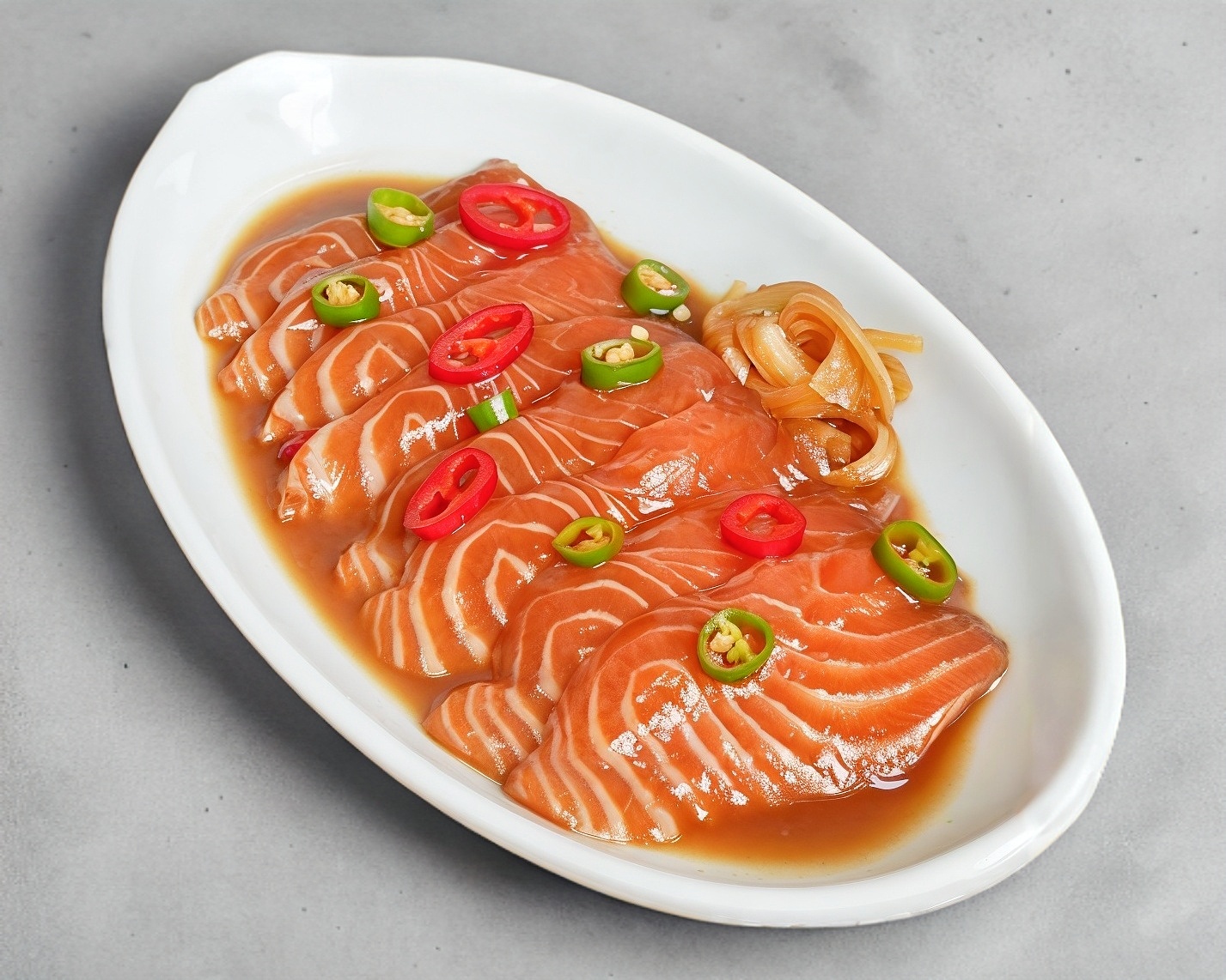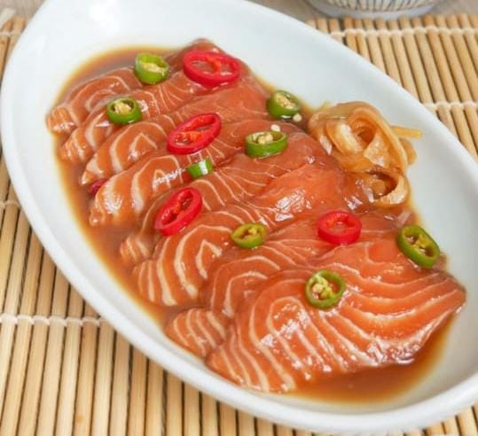 Salmón 200g, cebolla, aceitunas, alcaparras, cilantro y soya.
