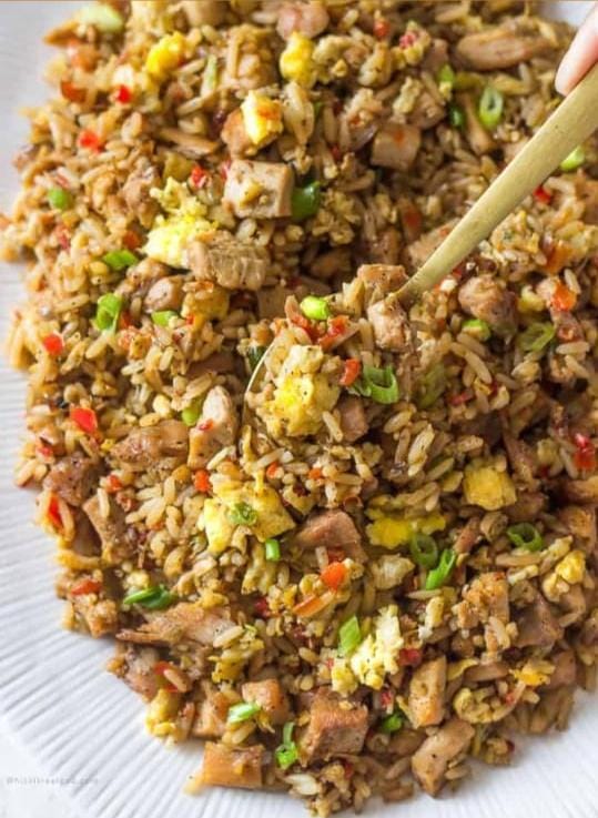 Arroz 200 g, pollo y cerdo 300 g, zanahoria, calabaza, germen, pimiento y soya.