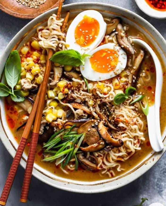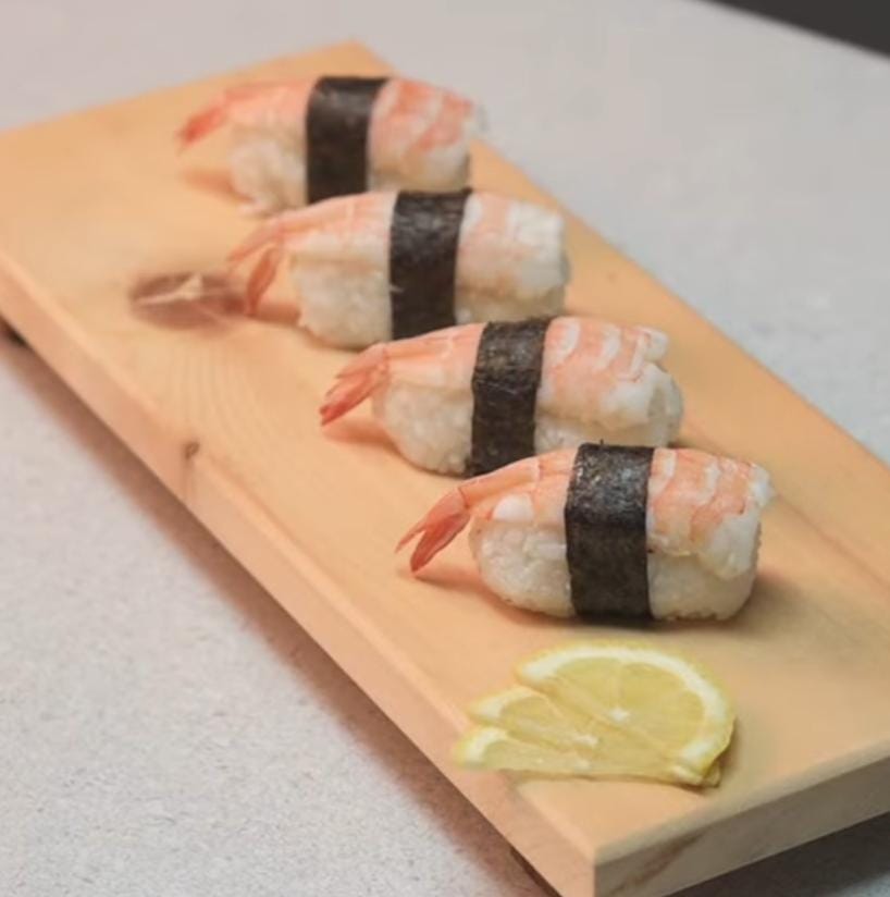 Carne de res 150 g, huevo cocido 1 ud, grano de elote 50 g y nori 20 g.